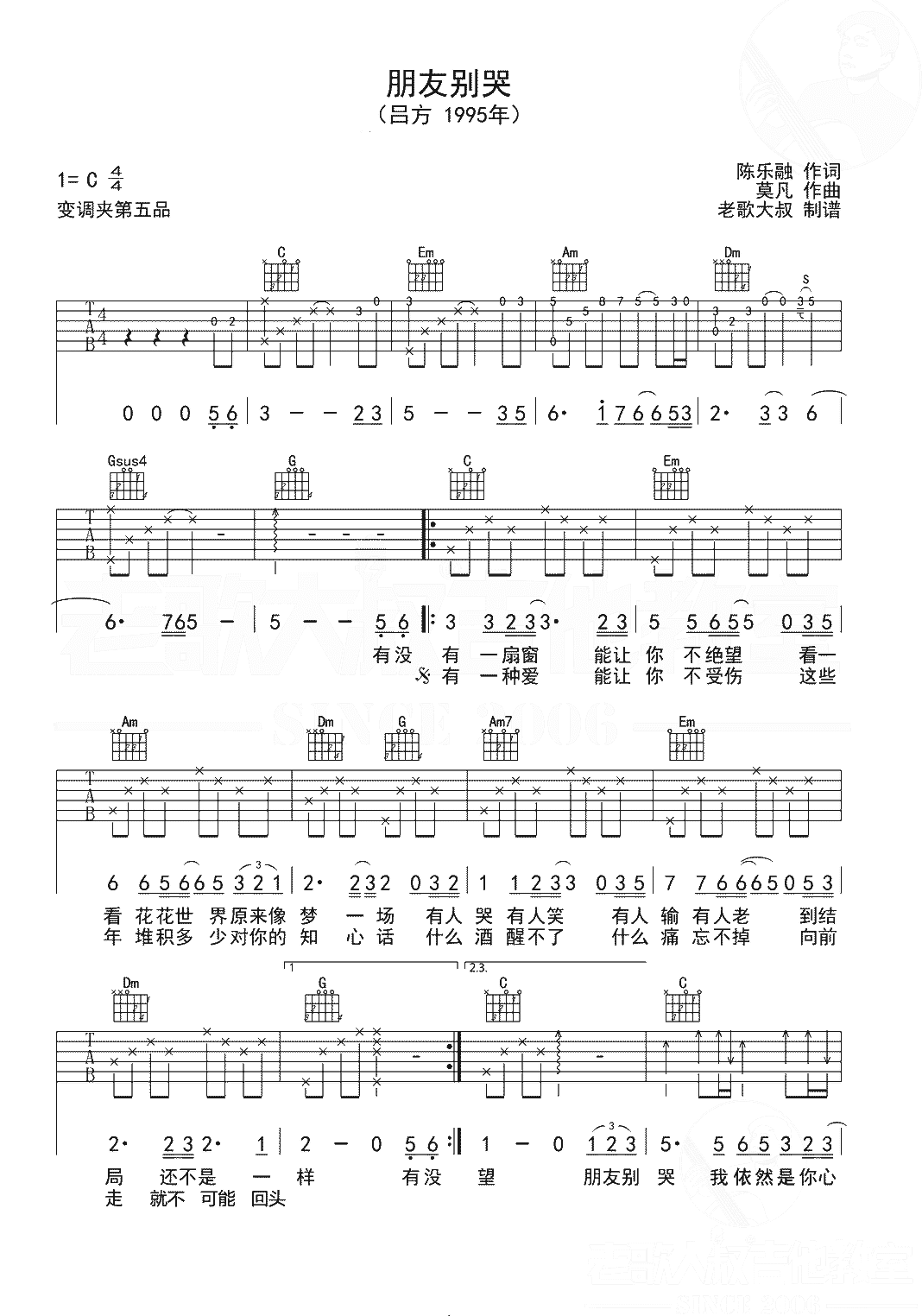 吕方《朋友别哭》吉他谱,老歌大叔编配出品,共有2张高清图谱,免翻页排版设计。吕方《朋友别哭》吉他谱_C调吉他弹唱谱