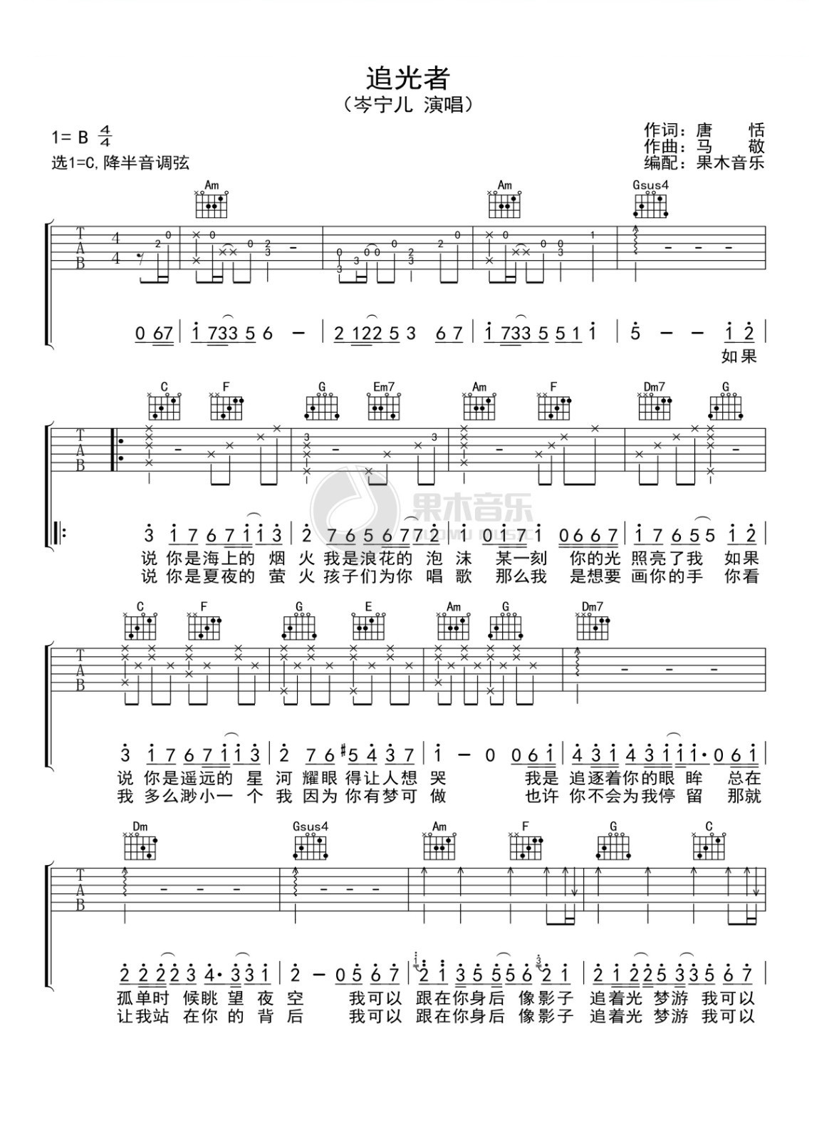 岑宁儿《追光者》吉他谱,果木音乐编配出品,共有2张高清图谱,免翻页排版设计。岑宁儿《追光者》吉他谱_C调吉他弹唱谱