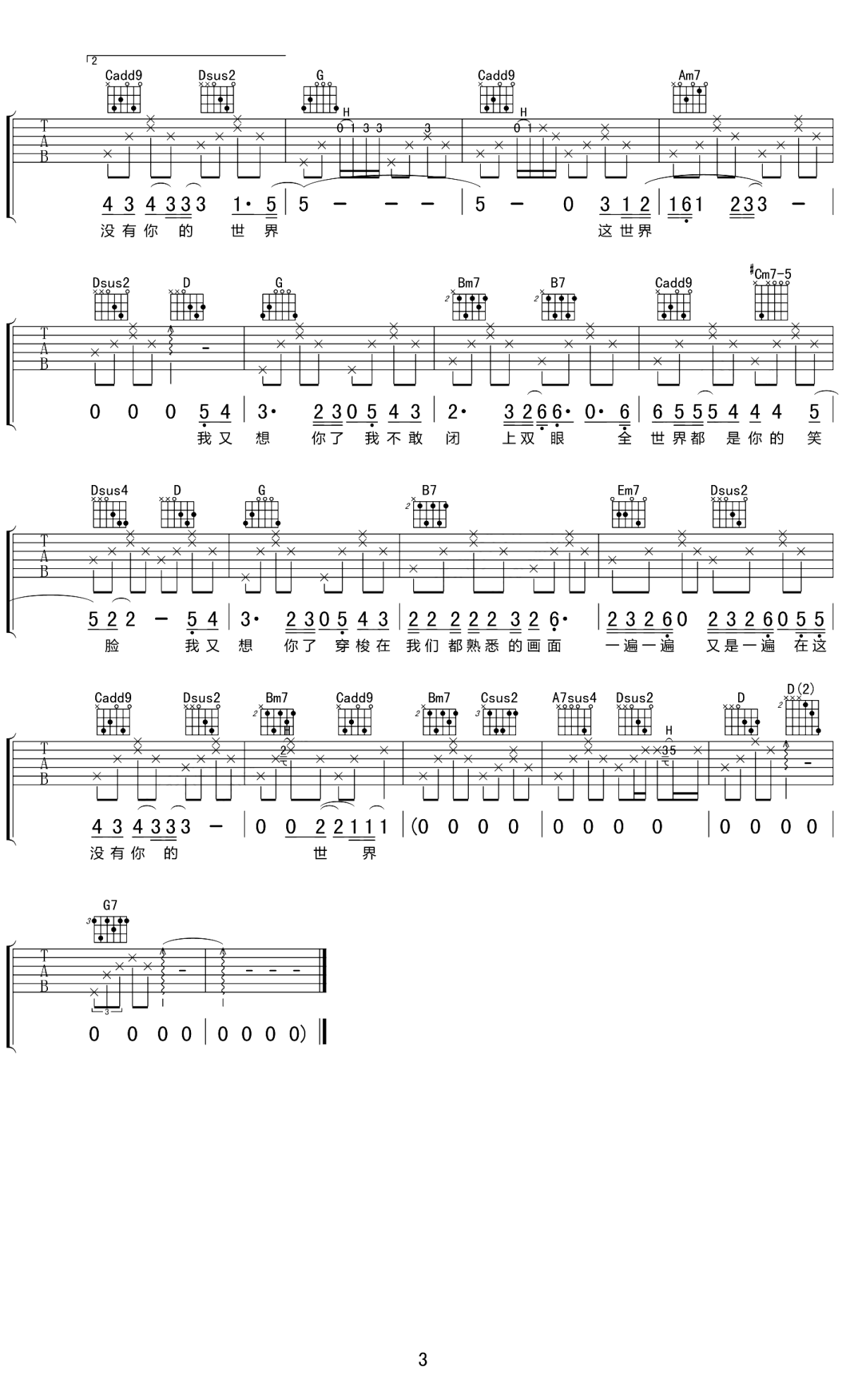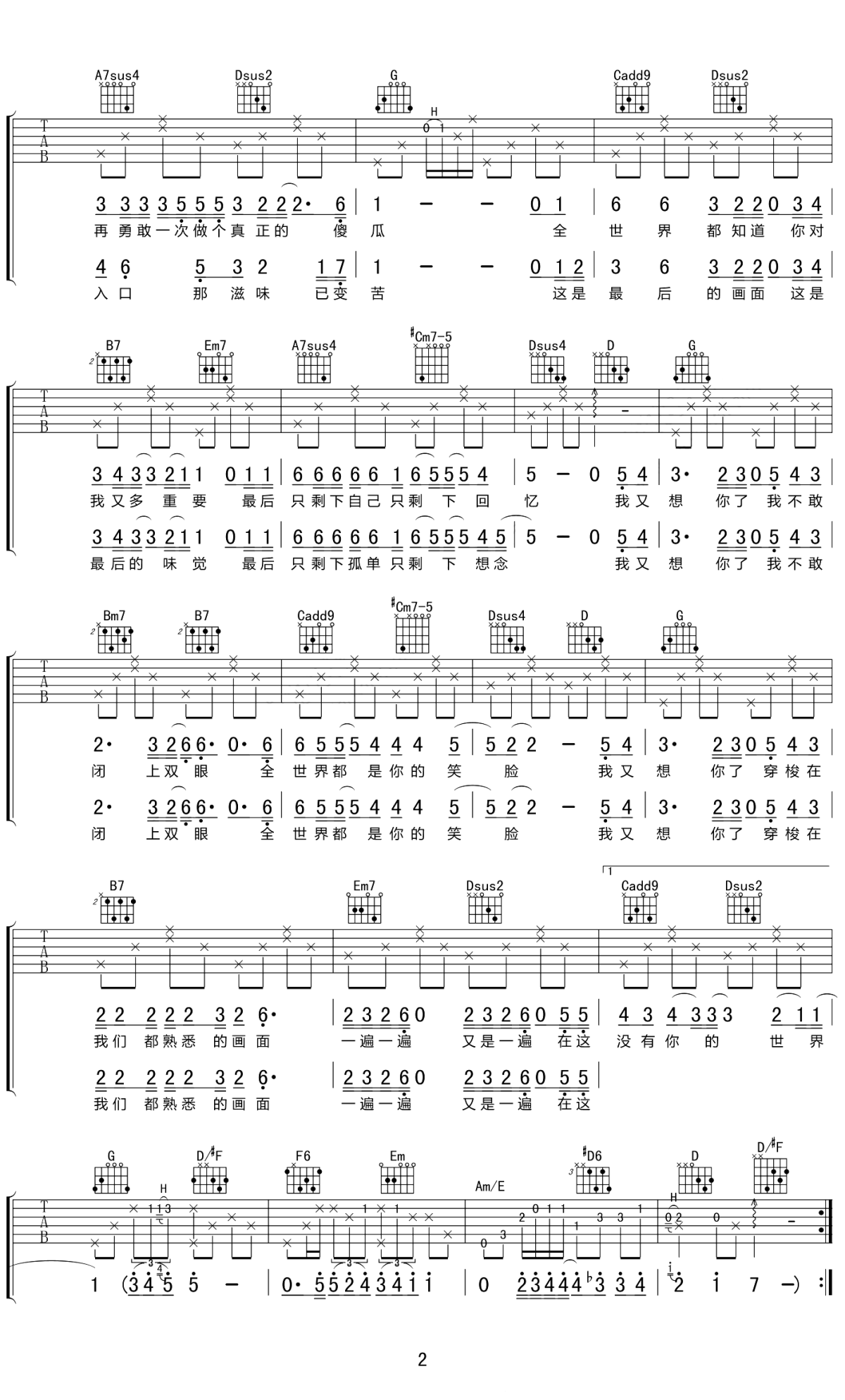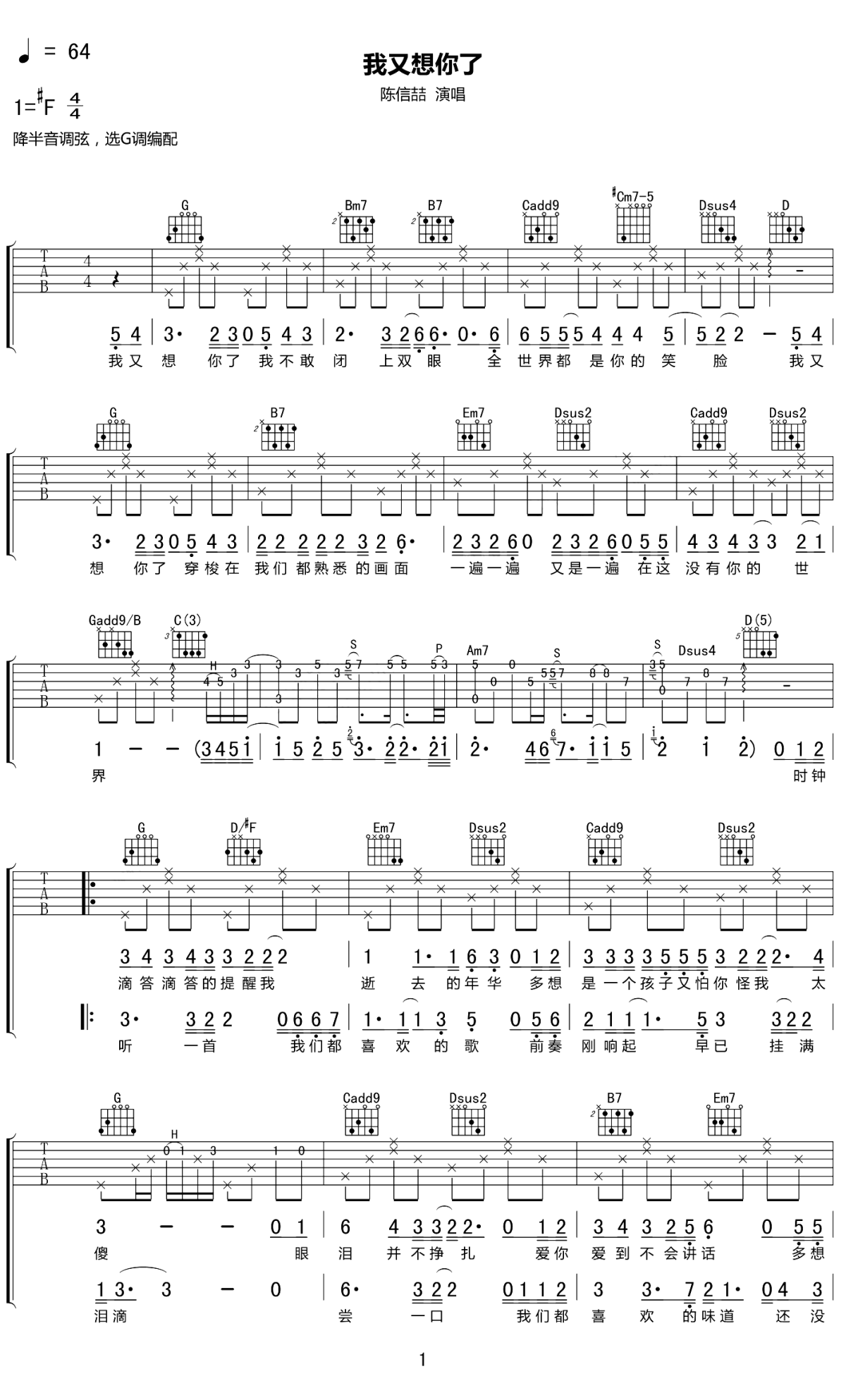 陈信喆《我又想你了》吉他谱,EThan 吉他编配出品,共有3张高清图谱。 我又想你了-陈信喆 词:刘雨知 曲:刘雨知 编曲:溪风 混音:EThan 吉他:尉迟春晓 我又想你了我不敢闭上双眼 全世界都是你的笑脸 我又想你了 穿梭在我们都熟悉的画面 一遍一遍又是一遍 在这没有你的世界 时钟滴答滴答提醒我逝去的年华 多想是一个孩子又怕 你怪我太傻 眼泪并不挣扎 爱你爱到不会讲话 多想再勇敢一次做个真正的傻瓜 全世界都知道你对我又多重要 最后只剩下自己只剩下回忆 我又想你了我不敢闭上双眼 全世界都是你的笑脸 我又想你了 穿梭在我们都熟悉的画面 一遍一遍又是一遍 在这没有你的世界 听一首我们都喜欢的歌 前奏刚响起早已挂满泪滴 尝一口我们都喜欢的味道 还没入口那滋味已变苦 这是最后的画面这是最后的味觉 最后只剩下孤单只剩下想念 我又想你了我不敢闭上双眼 全世界都是你的笑脸 我又想你了 穿梭在我们都熟悉的画面 一遍一遍又是一遍 在这没有你的世界 这世界 我又想你了我不敢闭上双眼 全世界都是你的笑脸 我又想你了 穿梭在我们都熟悉的画面 一遍一遍又是一遍 在这没有你的世界 歌曲结构很简单,但你听出第二段副歌部分,声音沙哑了。忙碌的时候,别忘记停下来休息一会。一首好歌,翻唱出自己的风格,又是一种不一样的魅力。 喜欢听他唱歌,喜欢这个努力上进,正能量的大男孩,他的歌声自带故事感,所以说,他是一个有故事的男同学。 陈信喆用他略带沧桑的嗓音,赋予了这首歌灵魂,96年出生的他,平时是一个大大咧咧的逗逼,任意切换各种模式,但是,一抱起吉他,他就完全换了一个样子,变成了一个认真的少年。 他说通过唱歌,可以把自己心里的不开心发泄出来,而且,他唱悲伤的歌,却充满了正能量,温暖治愈着每一个听歌的人。
