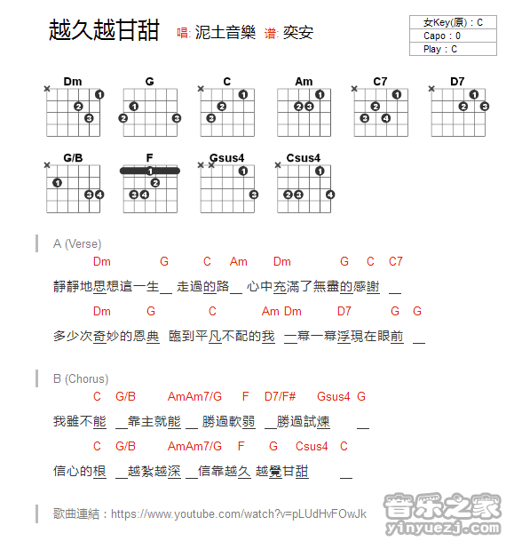 盛晓玫《越久越甘甜》吉他谱,YYZJ编配出品,共有1张高清图谱,免翻页排版设计。/