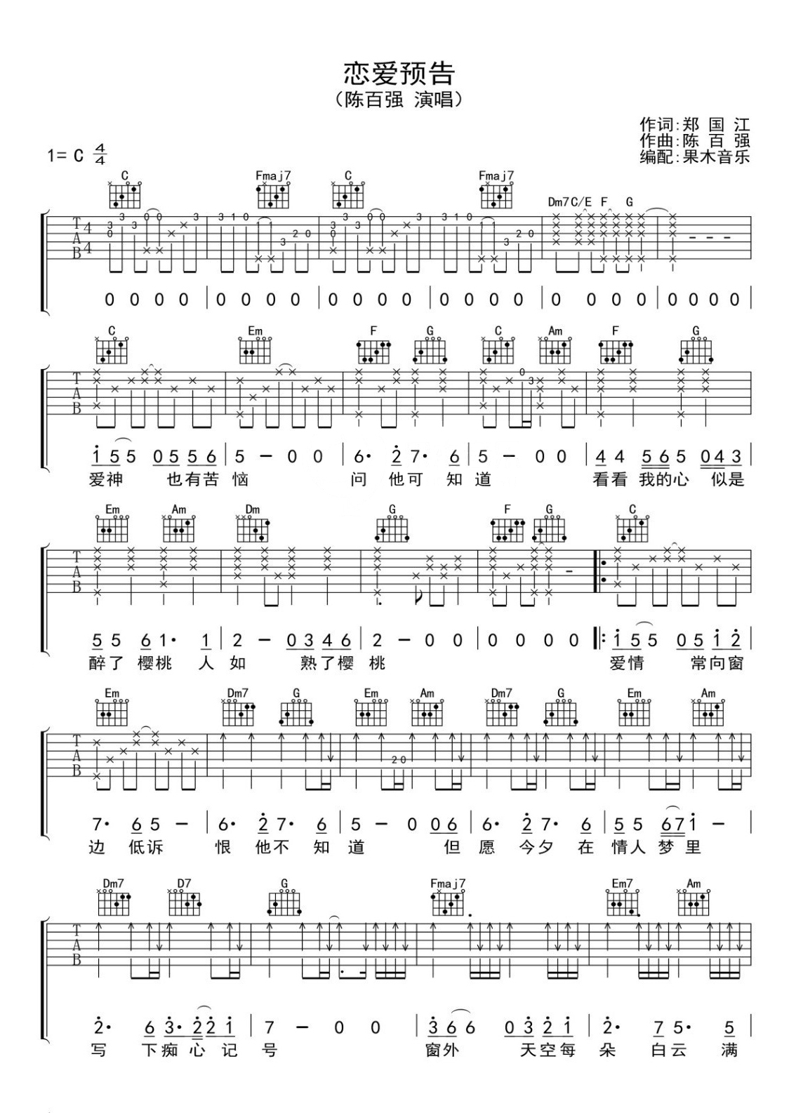 陈百强《恋爱预告》吉他谱,果木音乐编配出品,共有2张高清图谱,免翻页排版设计。