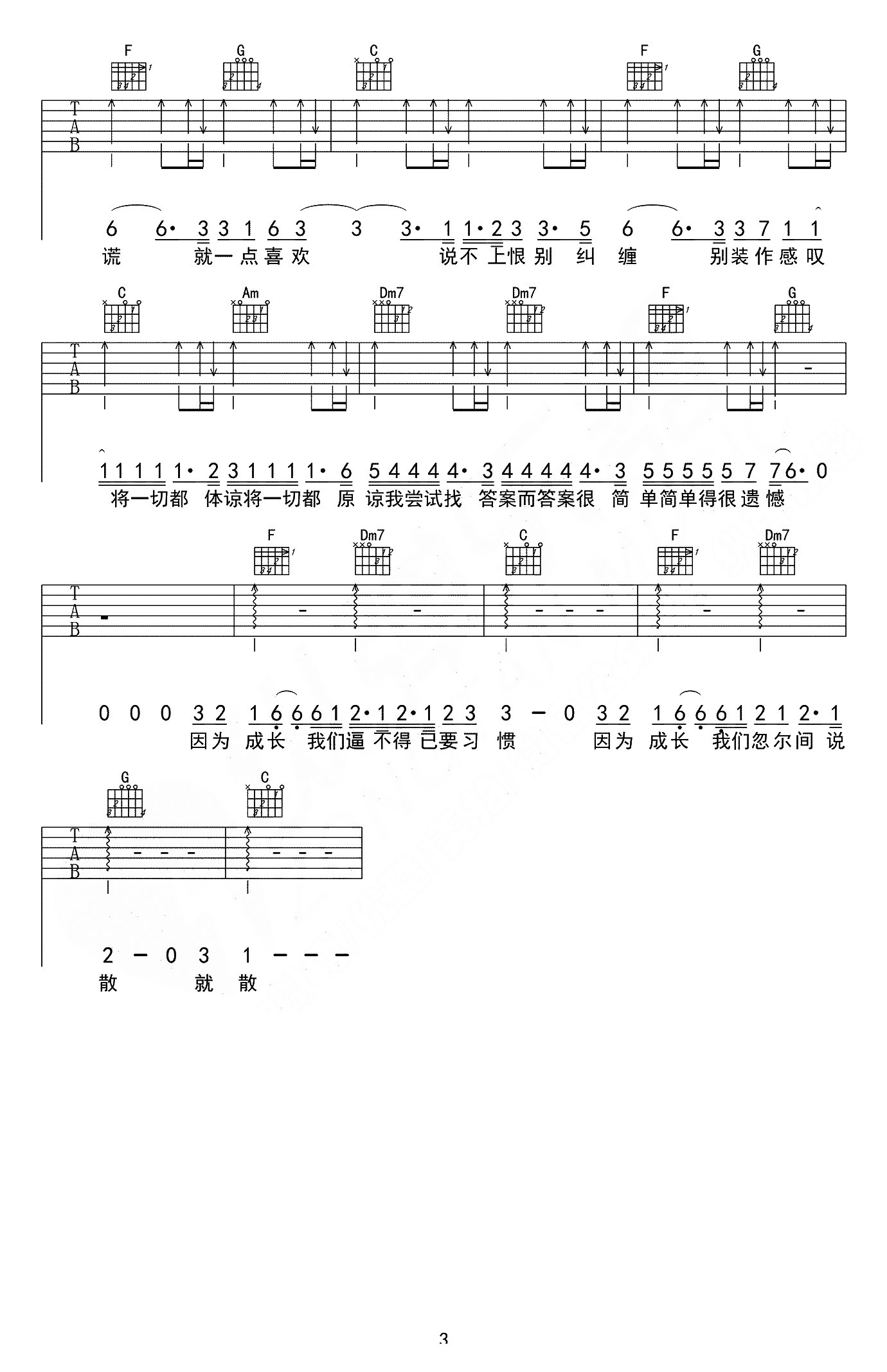 袁娅维《说散就散》吉他谱,纵弹乐器编配出品,共有3张高清图谱。袁娅维《说散就散》吉他谱,D调,变调夹夹第二品,电影《前任3》主题曲。无力回天的哭泣,生无可恋的倾靠。无疑,很多人都经历了这说散就散的故事。真正的离开总是悄无声息的。既然你爱Ta,就要在分开时,给一个拥抱,说一句再见,不是说散就散,不要说散就散。
