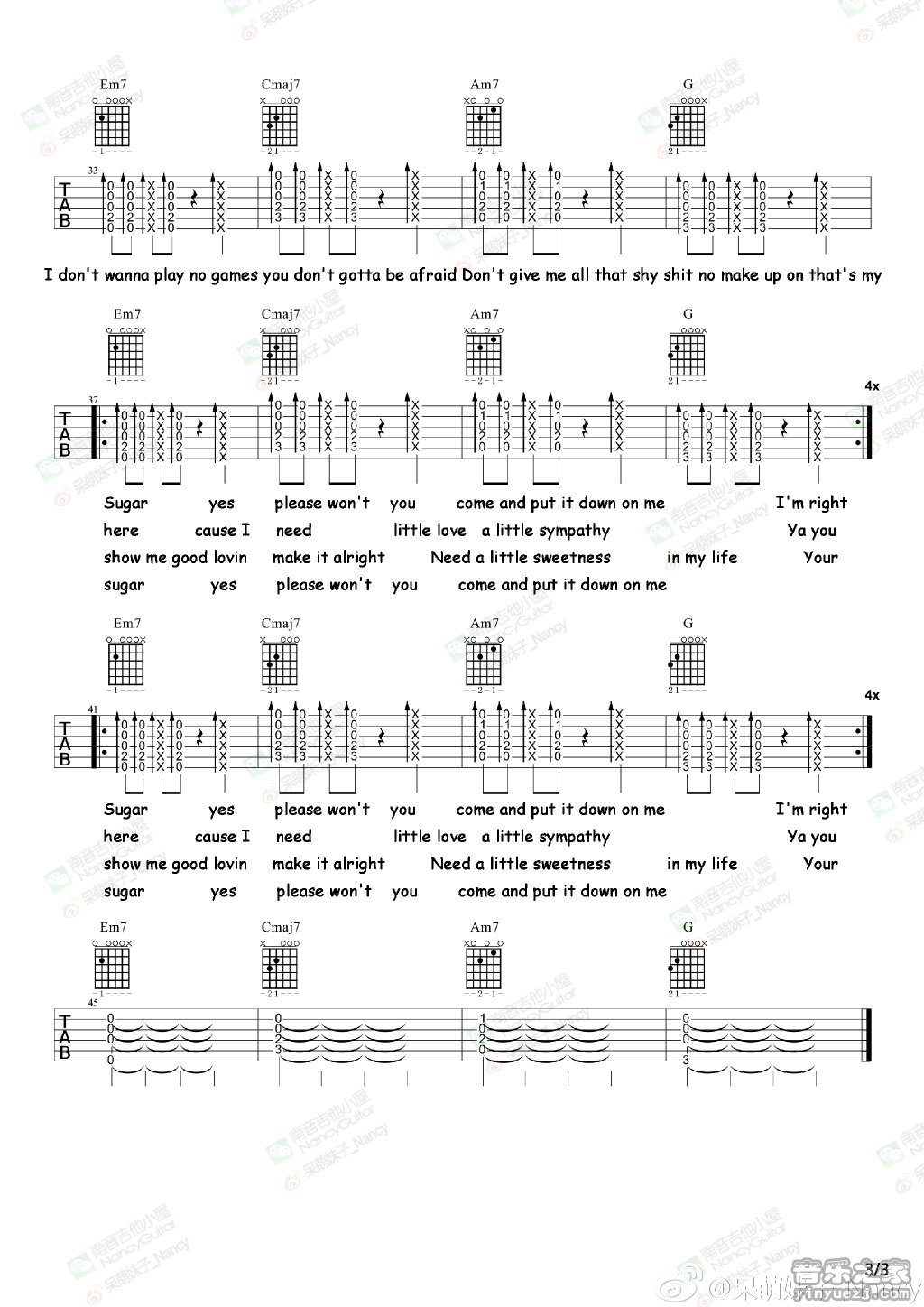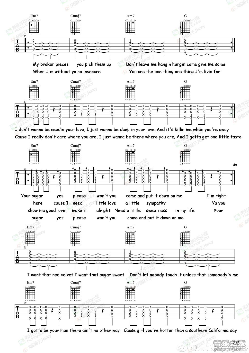 maroon5《sugar》吉他谱,南音吉他编配出品,共有3张高清图谱。