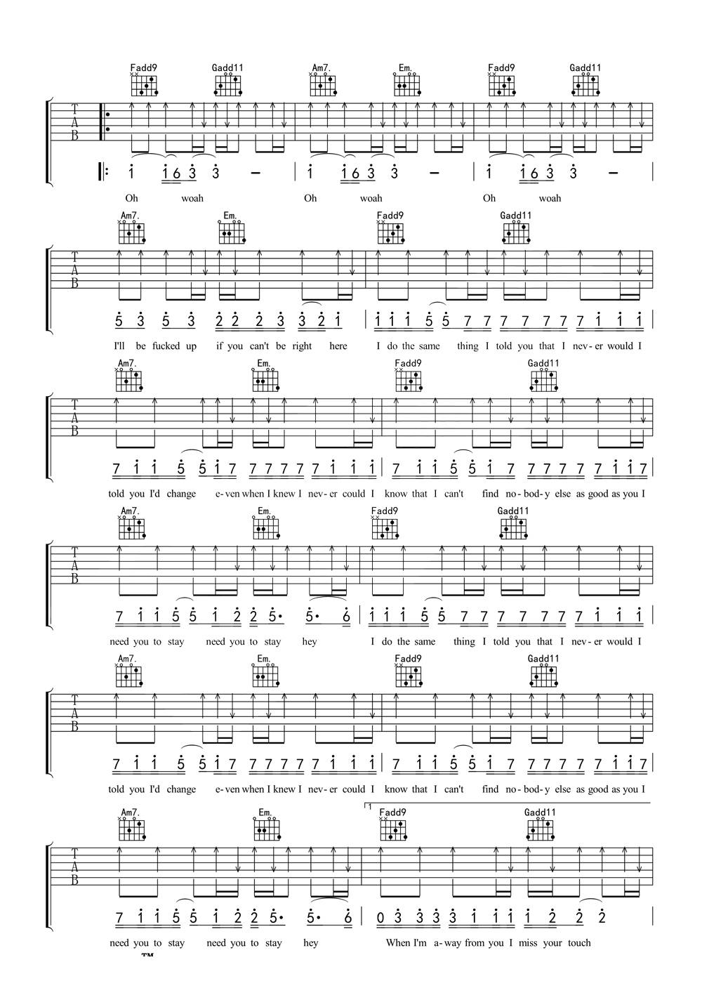 贾斯汀·比伯《Stay》吉他谱,无限延音编配出品,共有3张高清图谱。