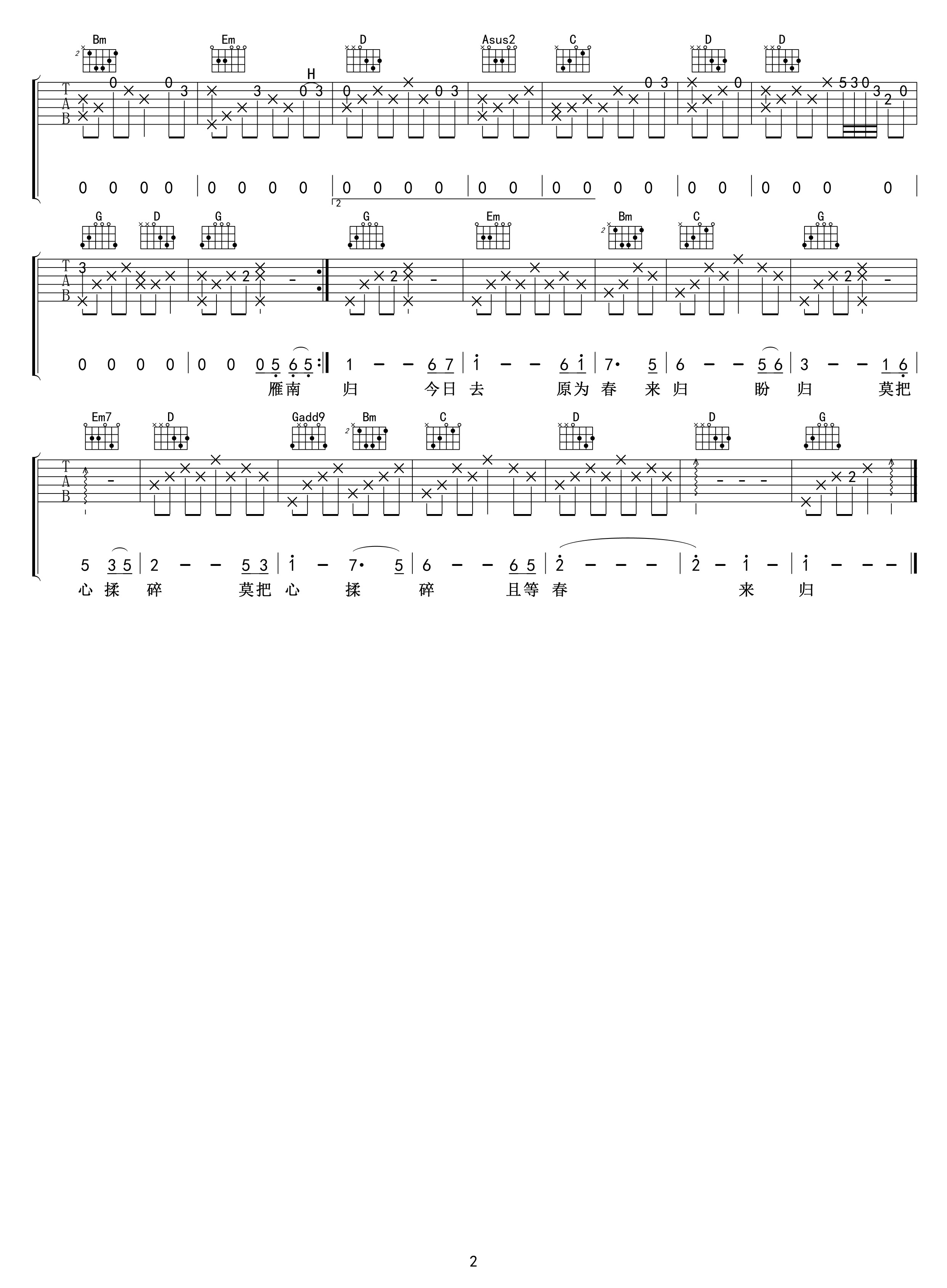 刘紫玲《雁南飞》吉他谱,共有2张高清图谱,免翻页排版设计。