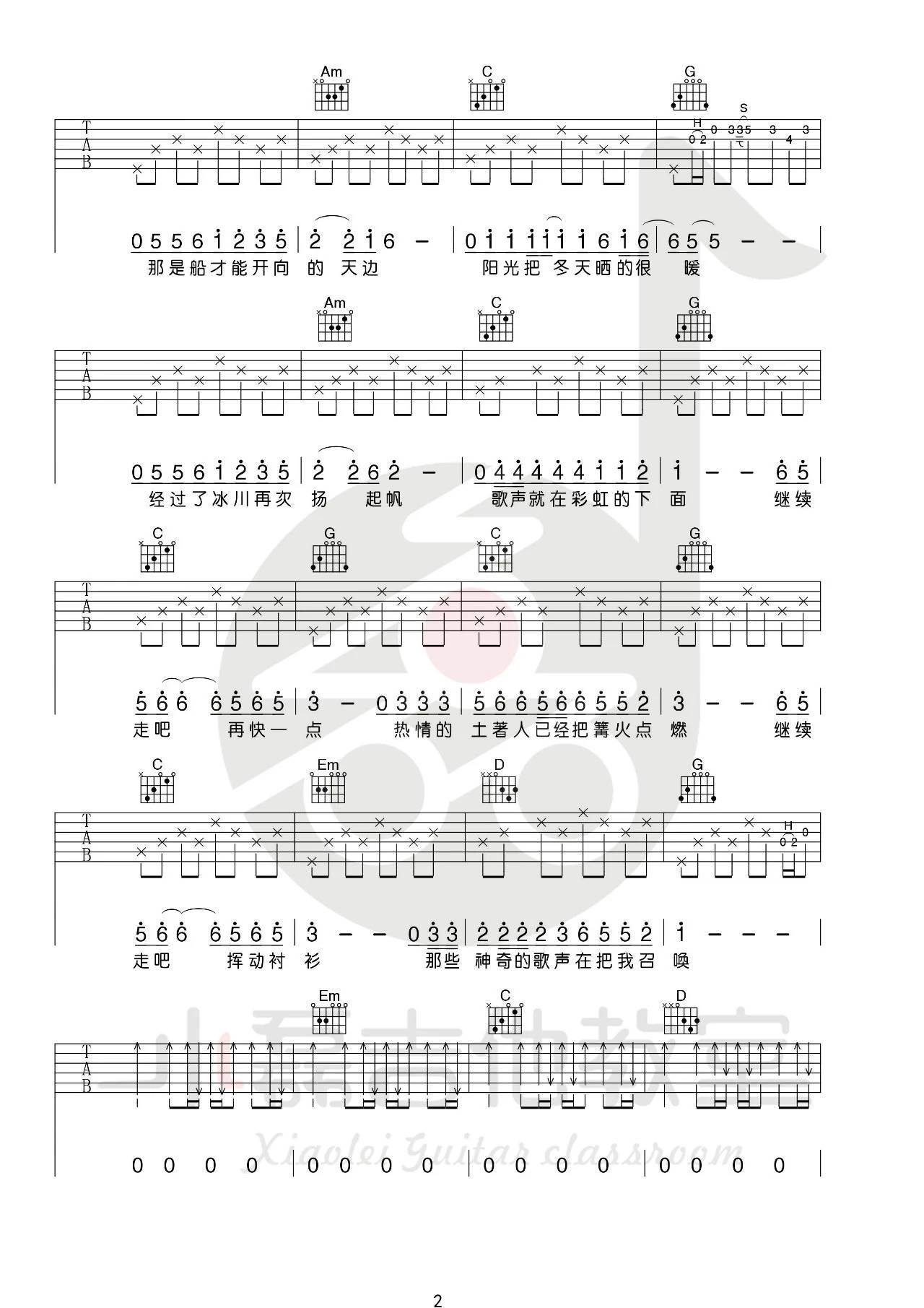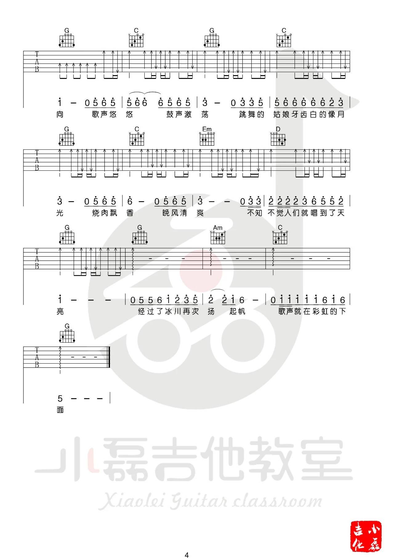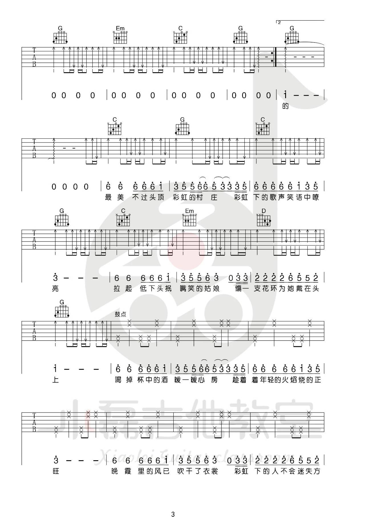 赵雷《彩虹下面》吉他谱,小磊吉他编配出品,共有4张高清图谱。这首歌原版中有大量的乐队成分,也比较欢快,前奏的口哨更是把我们带入了悠闲且认真的氛围!前奏我们用到了扫弦的编排,其实原版中还有很多乐器,我们由于自己弹唱所以不得不割舍!在弹唱部分小磊老师设计的比较简单,也是为了大家能更好的弹唱!在第二段副歌的位置我们用到了打击乐的成分,敲击几个的面板和侧板会得到打击的音色,也是为了让歌曲的层次更加丰富一些!整体难度不高,演奏的气氛更加重要一些!难度:4级