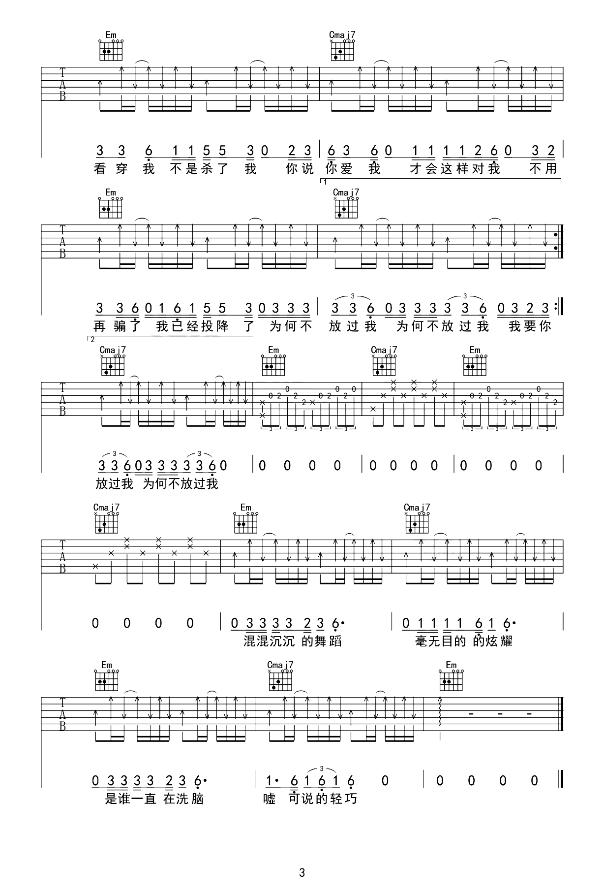 悲伤玩具《我要你看穿我而不是杀了我》吉他谱,革命吉他编配出品,共有2张高清图谱,免翻页排版设计。我要你看穿我而不是杀了我吉他谱,悲伤玩具的一首热门歌曲。歌声向我们传达了一种深深的无力感和投降的情绪。《我要你看穿我而不是杀了我》吉他弹唱谱,原调为B调,选用G调指法,变调夹夹第四品,完整版编配共三张图片六线谱,感谢革命吉他制谱分享,吉他事上传分享。 愿你洞悉我,不是为了毁我,不是玩弄我心中的弱点,让我饱受折磨,不是曝露我的卑微后,再以拯救之名来改变我。歌曲是对这个世界中的偏见和指责的一种无力抗争。