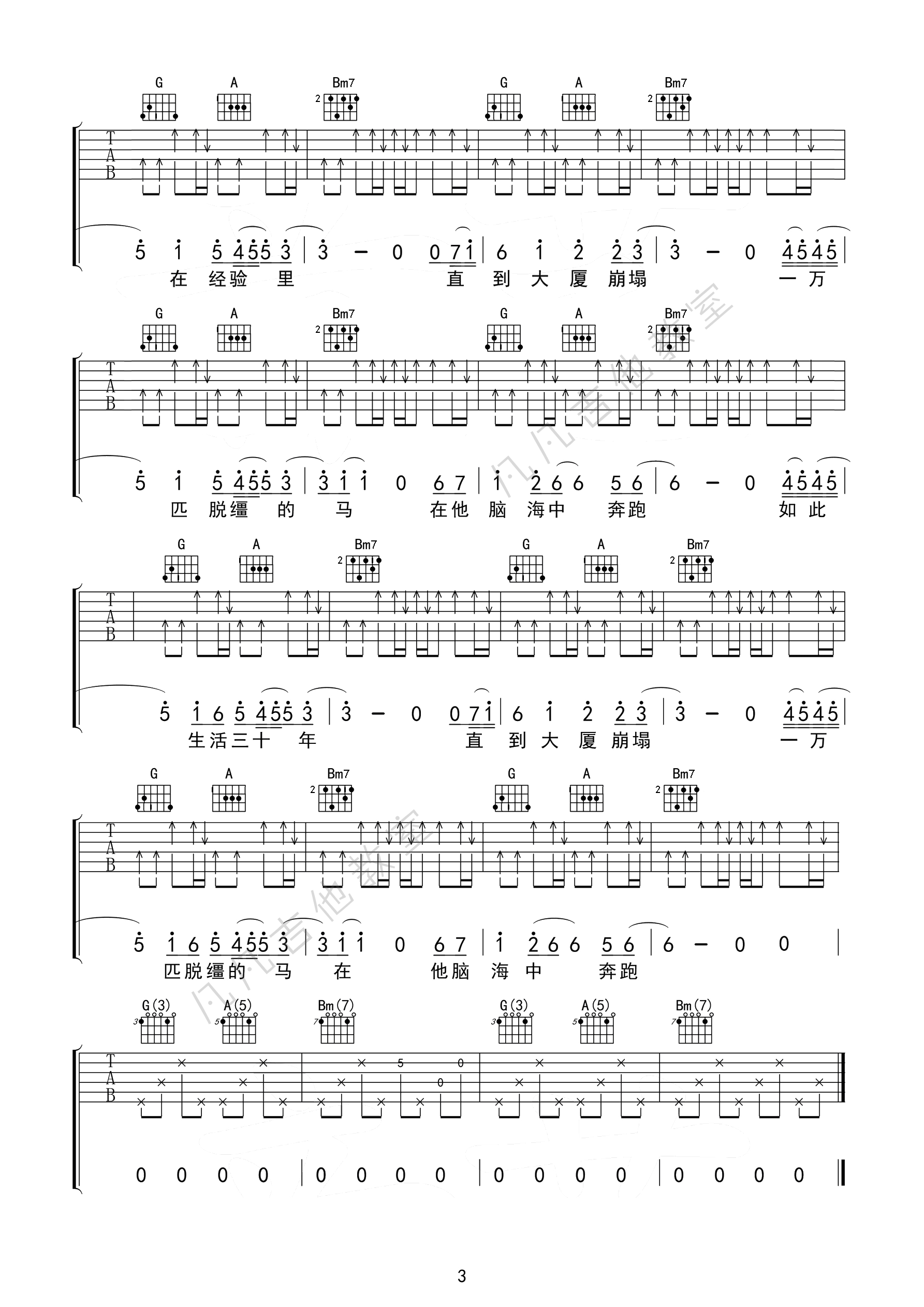 万能青年旅店《杀死那个石家庄人》吉他谱,共有3张高清图谱。