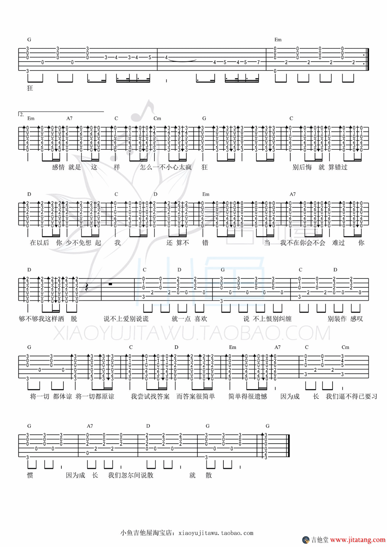 《说散就散》吉他谱,小鱼吉他屋编配出品,共有2张高清图谱,免翻页排版设计。蹿红网络的《说散就散》,电影《前任3:再见前任》的主题曲,让人听一遍就爱上了。喜欢听的无非就是唱出了自己隐藏内心想表达的想法吧,网上男女声翻唱的版本也很多,一段用情至深的感情,伴随着消失殆尽的新鲜感,难逃遗憾收场,饱含感情的声音唱出了暗涌的情绪,唱出了爱人之间的折磨纠缠,更触动了每一位有故事的人。
