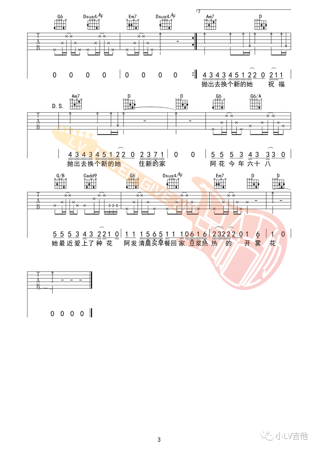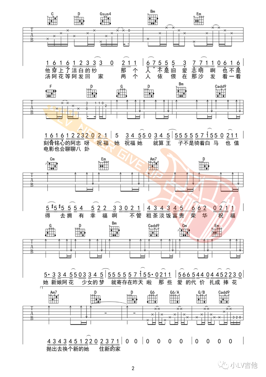 金玟岐《新娘阿花》吉他谱,革命吉他编配出品,共有3张高清图谱。