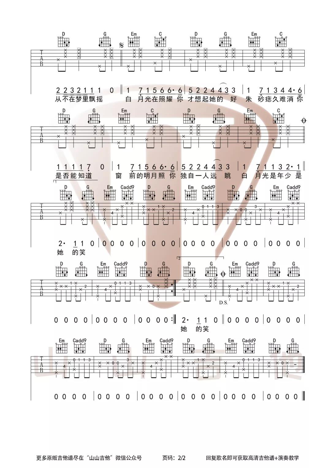 大籽《白月光与朱砂痣》吉他谱,山山吉他编配出品,共有2张高清图谱,免翻页排版设计。张爱玲在《红玫瑰与白玫瑰》里写道:也许每一个男子全都有过这样专属的两个女人,至少两个。娶了红致瑰,久而久之,红的变了墙上的一抹蚊子血,白的还是窗前明月光;娶了白玫瑰,白的便是粘在衣服上的一粒饭粒子,红的却是心口上的一颗朱砂痣。 关于这段话一直以来每个人都有自己的见解,今天我们给大家带来的就是以这个典故来命名的歌曲《白月光与朱砂痣》是由歌手 大籽 演唱,在今年的元旦才刚刚发布,并且已经登上了各大音乐排行榜的榜首,很多粉丝都在后台求谱,今天,谱来了!