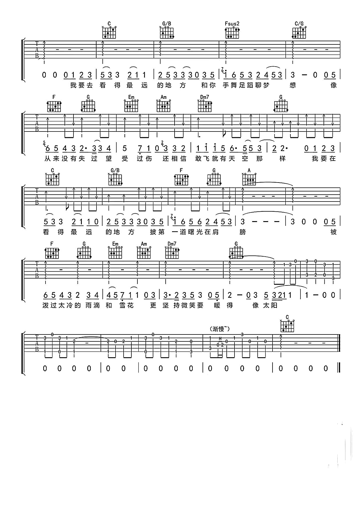 毛不易《看得最远的地方》吉他谱,采用C调指法编配,共有3张高清图谱。《看得最远的地方》吉他谱,毛不易的歌声总是带给我们治愈的力量,原唱来自于张韶涵的经典老歌。看得最远的地方吉他弹唱谱,选用C调指法编配,变调夹3品。六线谱共三张图片谱例,曲谱宝上传更新。 别对自己失望,要拥有坚韧的信念,迎着黎明前进,会看到更广阔的天际。那是我日益向往的未来,因为我坚信只要我心怀向往,未来一定会属于我。愿我们的自我,能够翱翔至更远的地方。