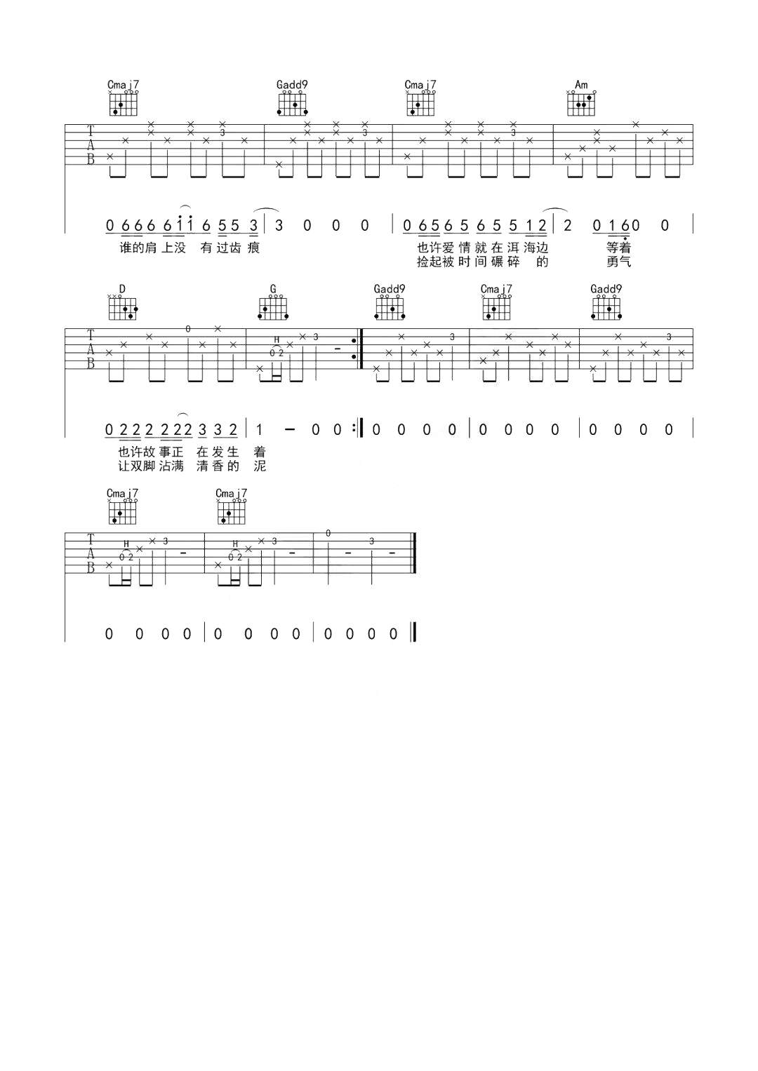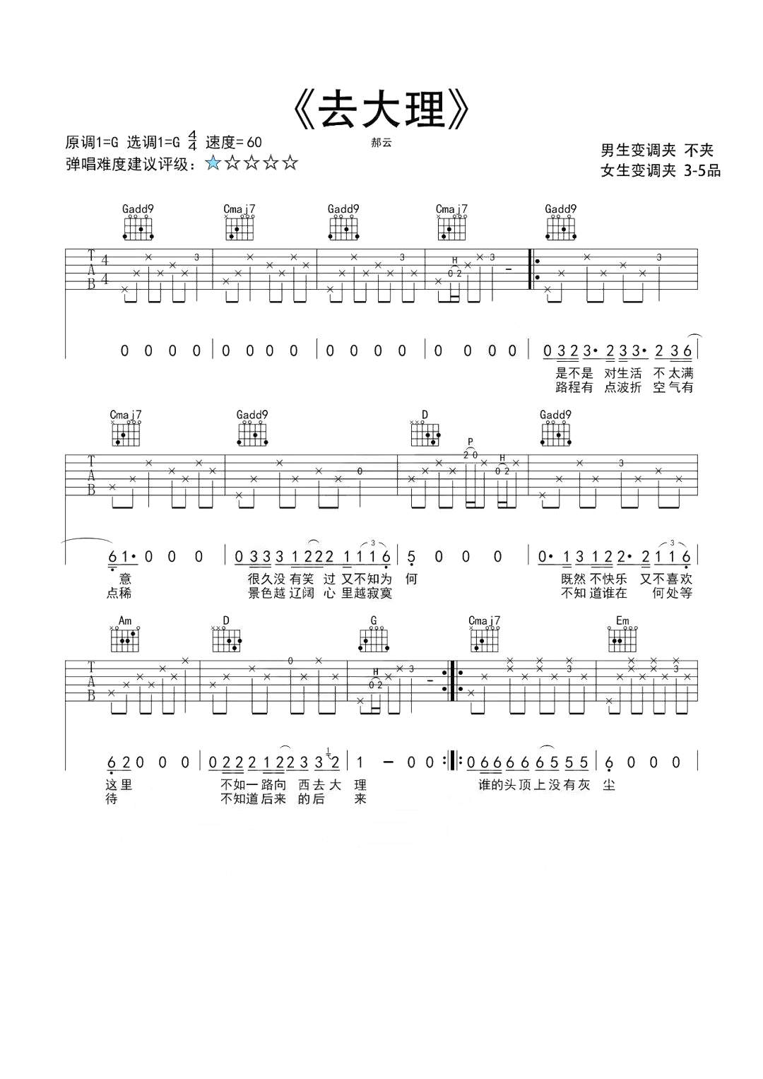 郝云《去大理》吉他谱 - 很多人都在弹的版本