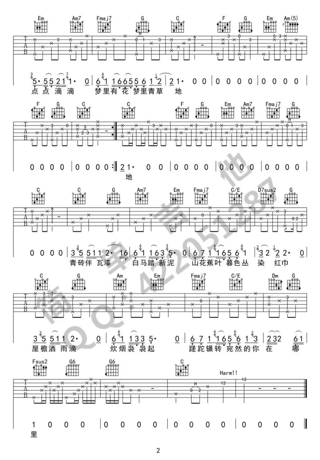 简单吉他《声声慢》吉他谱,简单吉他编配出品,共有2张高清图谱,免翻页排版设计。