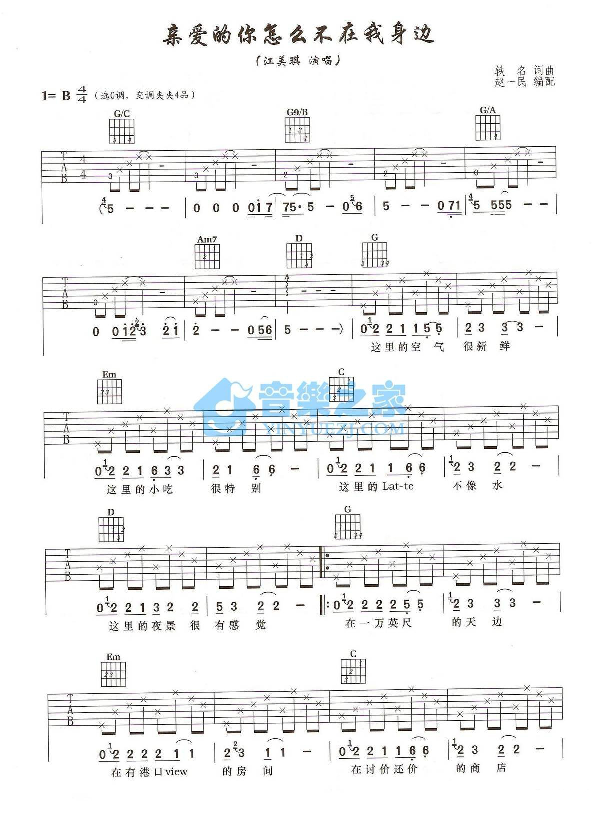 G调版《亲爱的你怎么不在我身边》吉他弹唱六线谱...