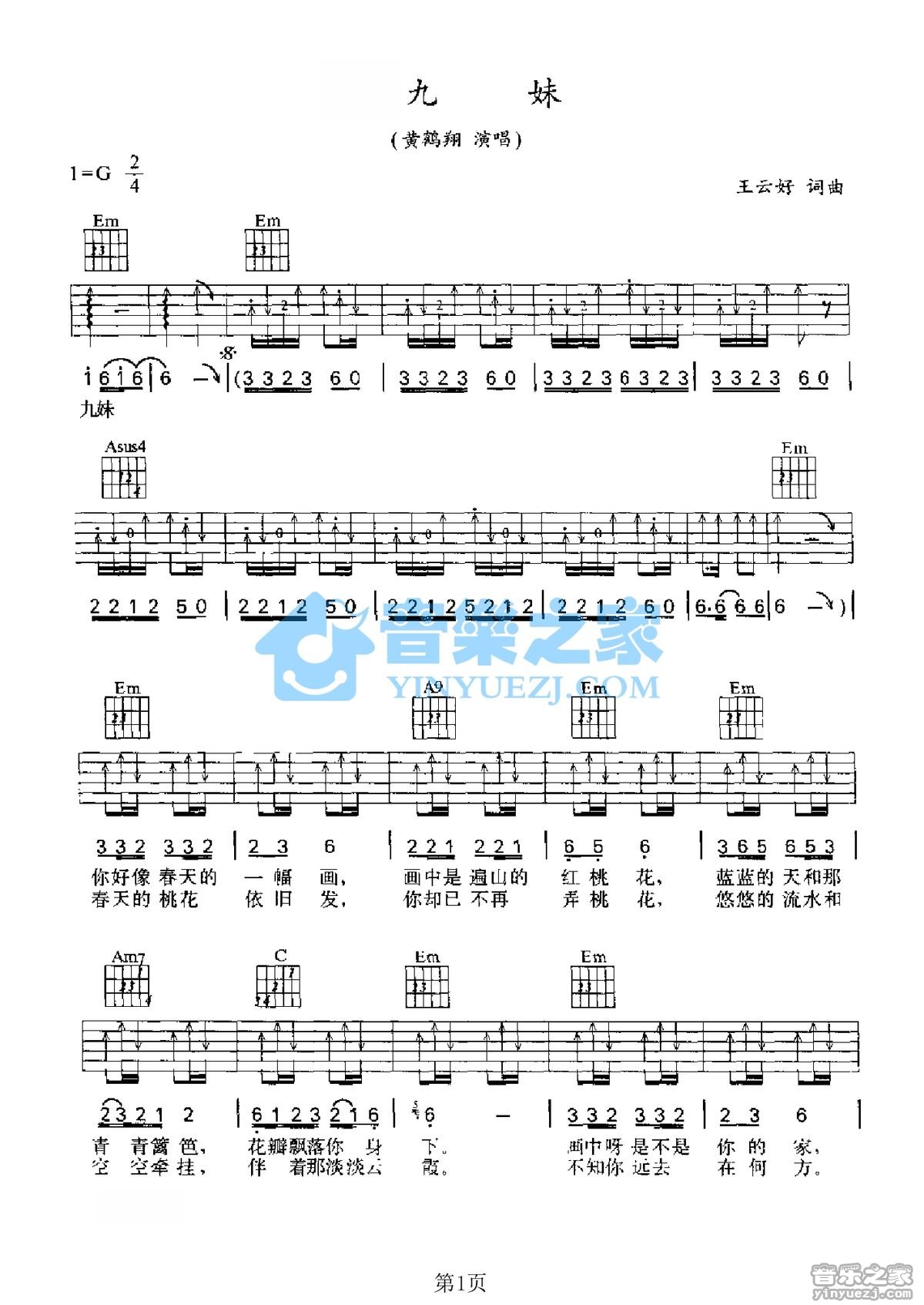 吉他黄鹤翔《九妹》吉他谱 - 免费版