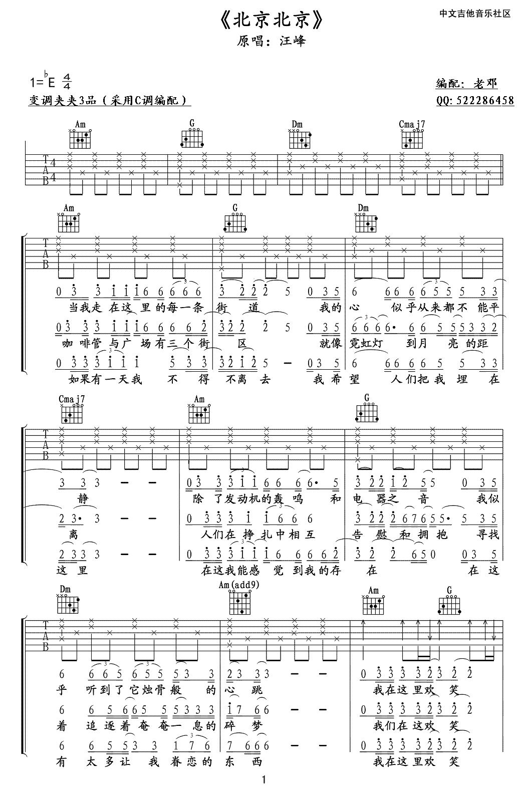 汪峰北京北京吉他谱六线谱C调版【高清谱】...
