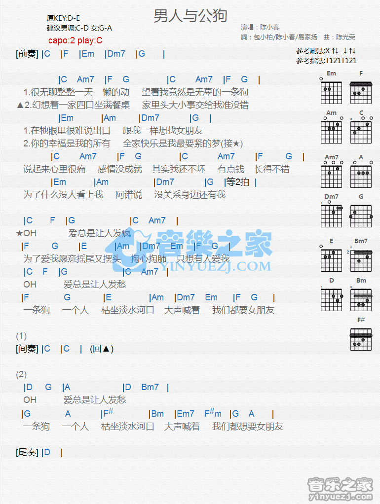 C调版陈小春《男人与公狗》吉他和弦弹唱谱...