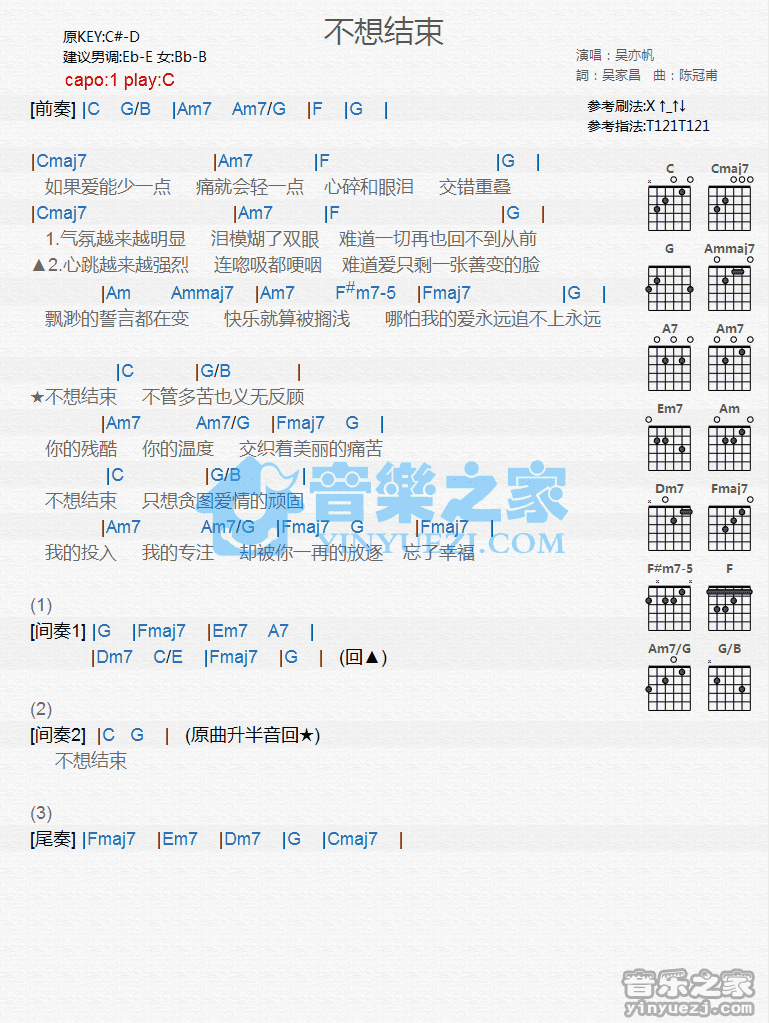 C调版吴亦帆《不想结束》吉他和弦弹唱谱...