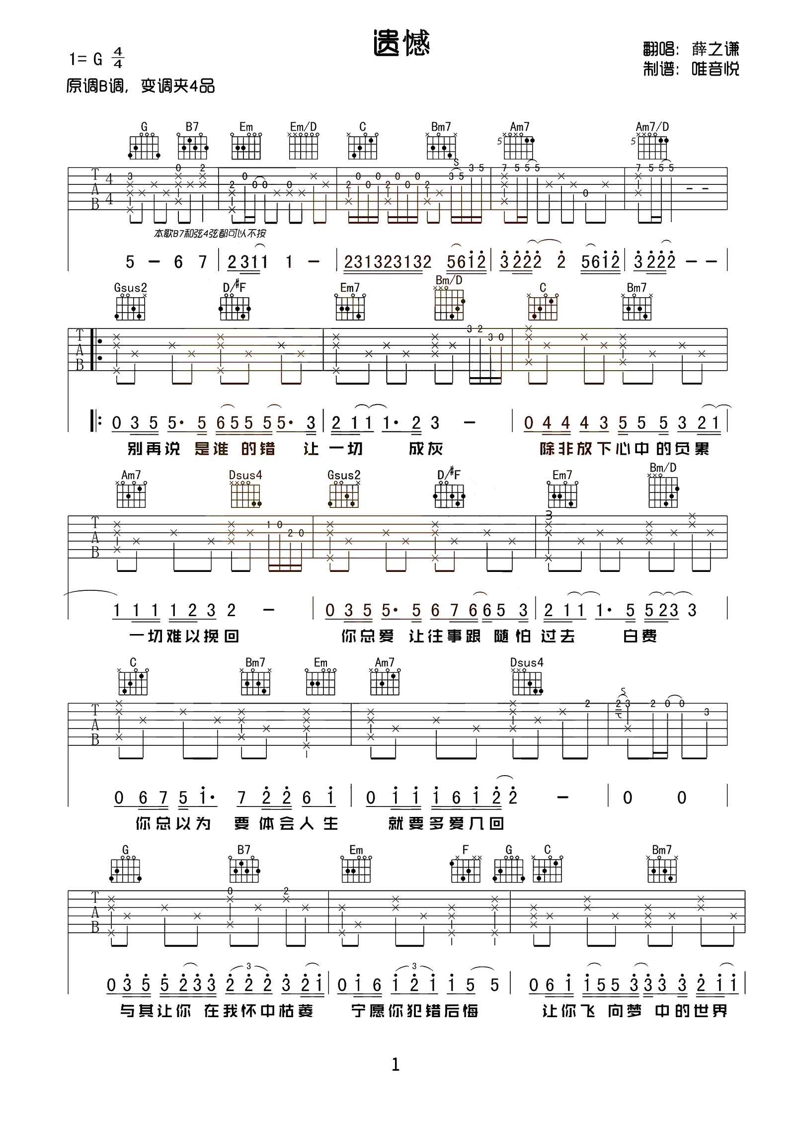 吉他薛之谦《遗憾》吉他谱 - 免费版