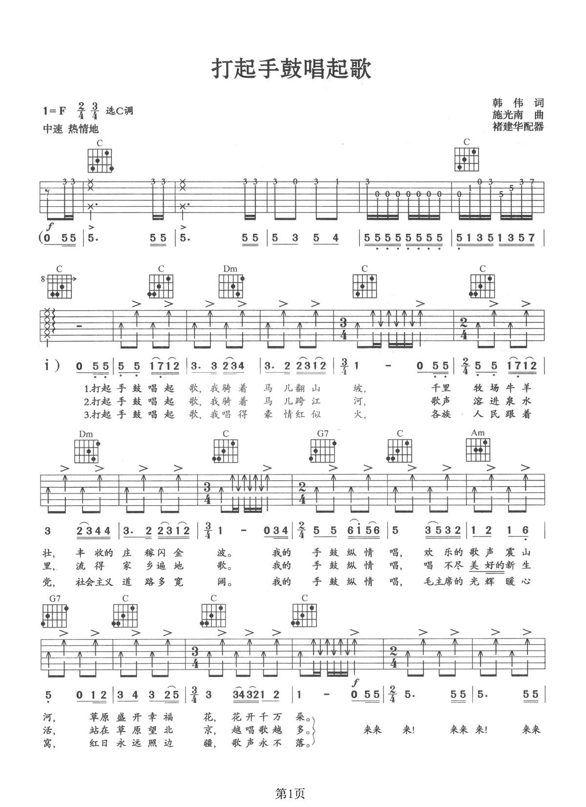 C调版红色经典《打起手鼓唱起歌》吉他弹唱六线谱...