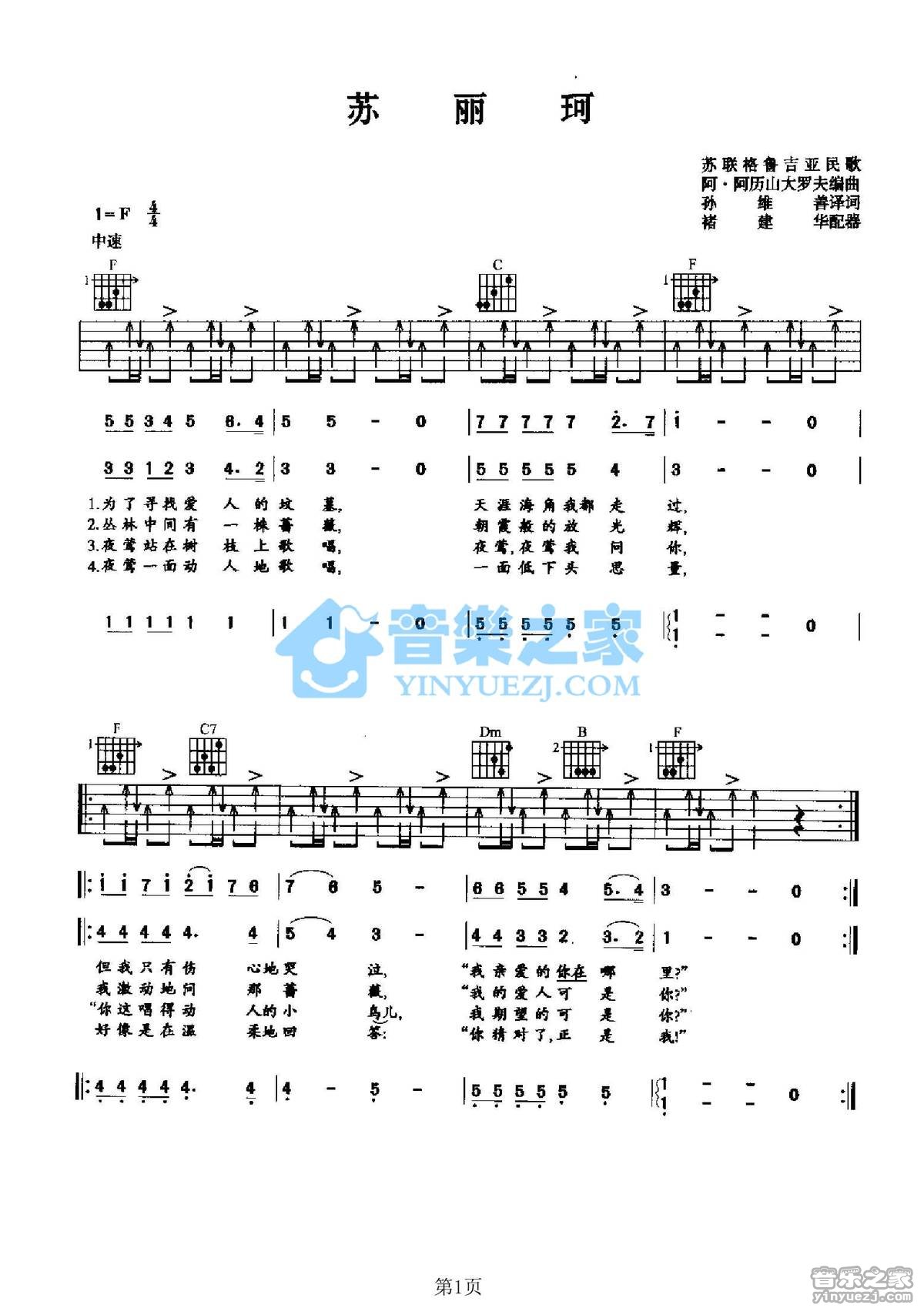 F调版苏联民歌《苏丽珂》吉他弹唱六线谱...