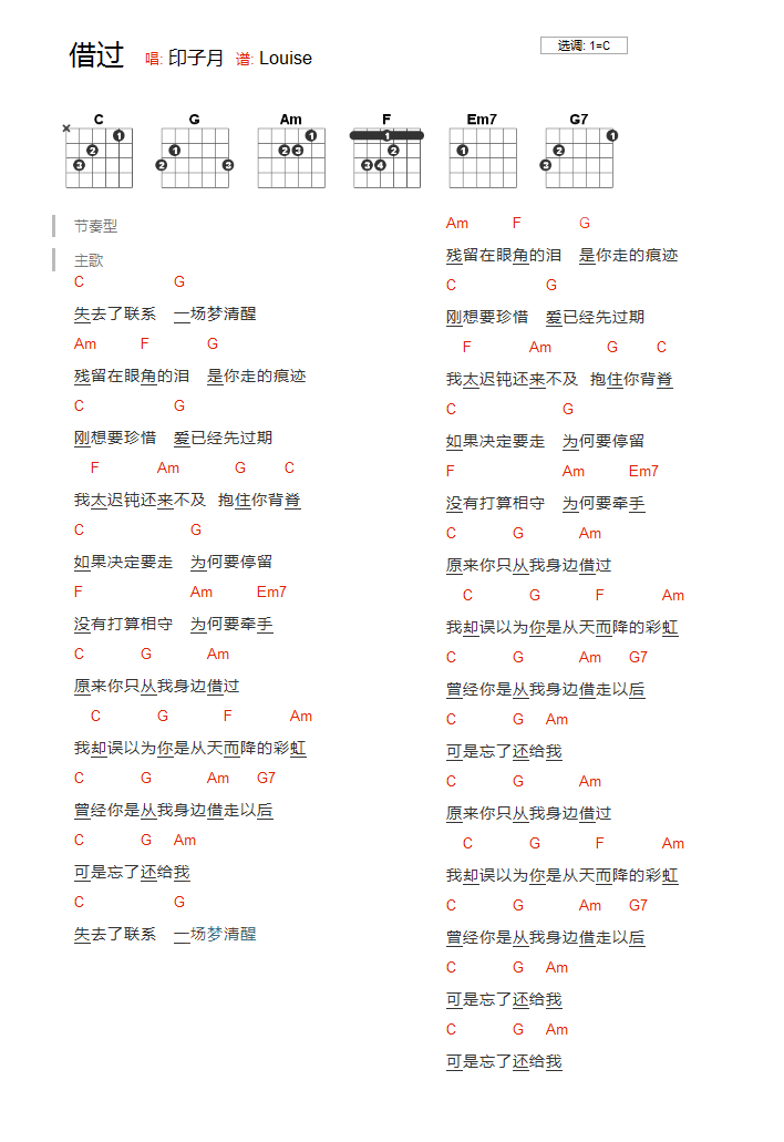 C调版艾怡良《寂寞无害》吉他和弦弹唱谱...