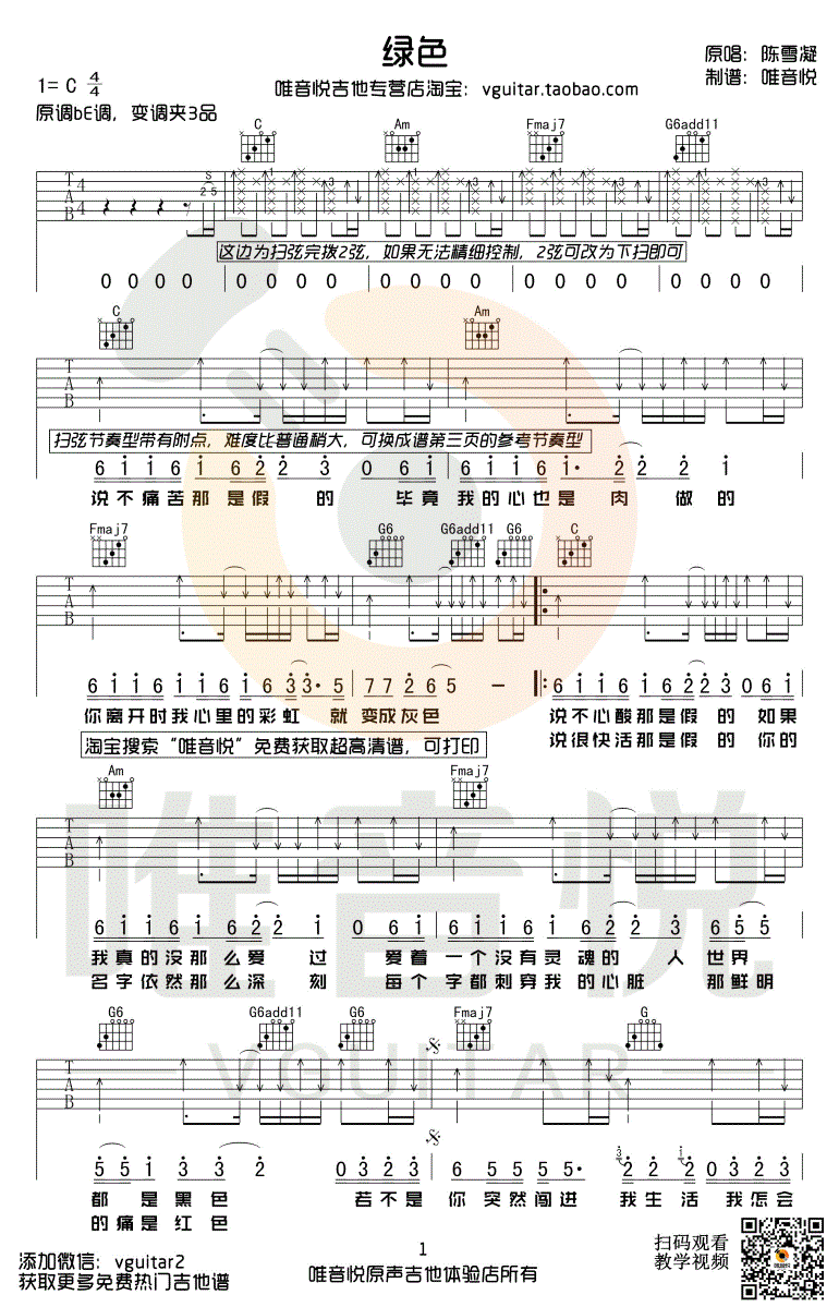 吉他陈雪凝《绿色》吉他谱 - 小编推荐练习