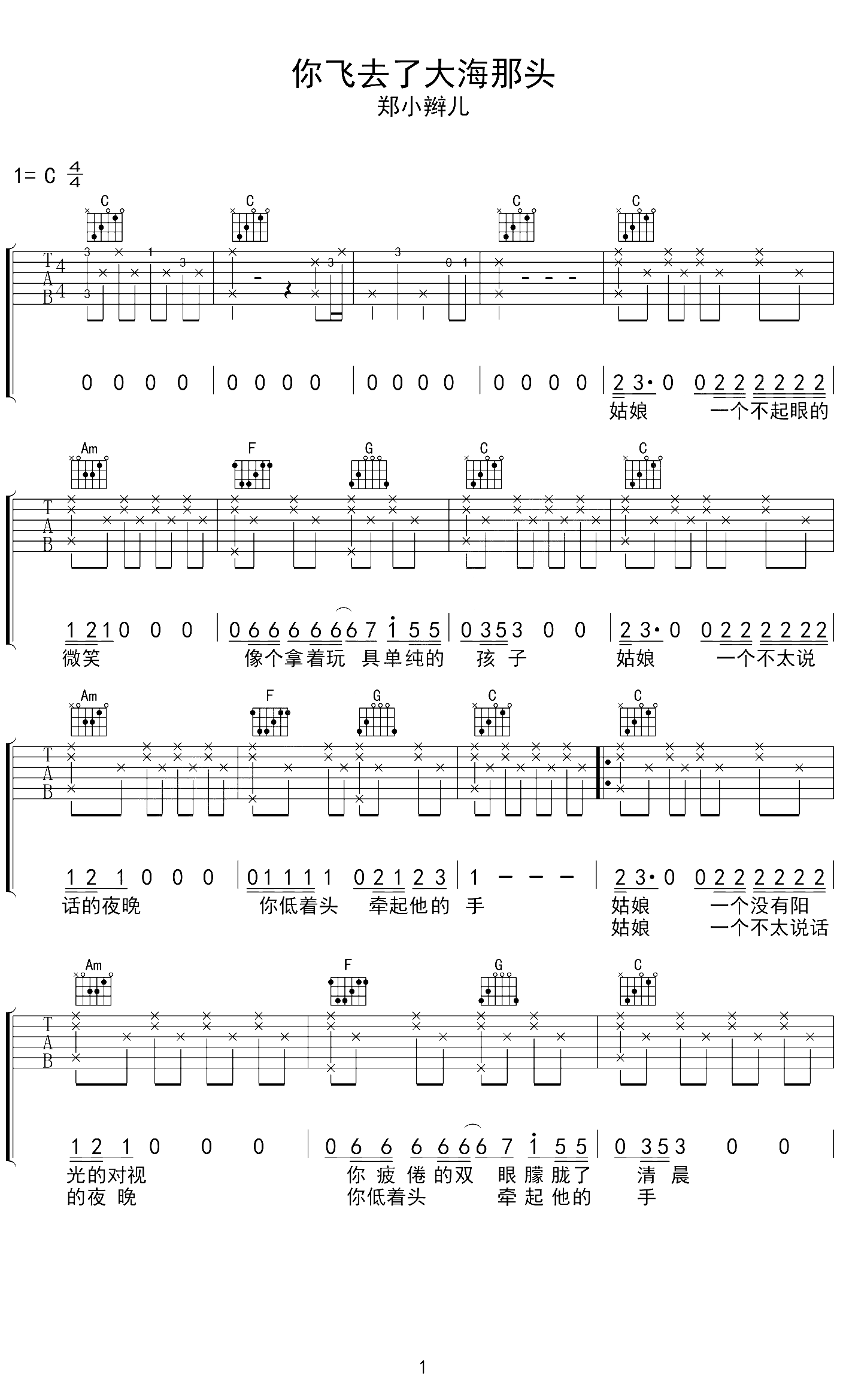 吉他郑小辫儿《你飞去了大海那头》吉他谱 - 推荐版本