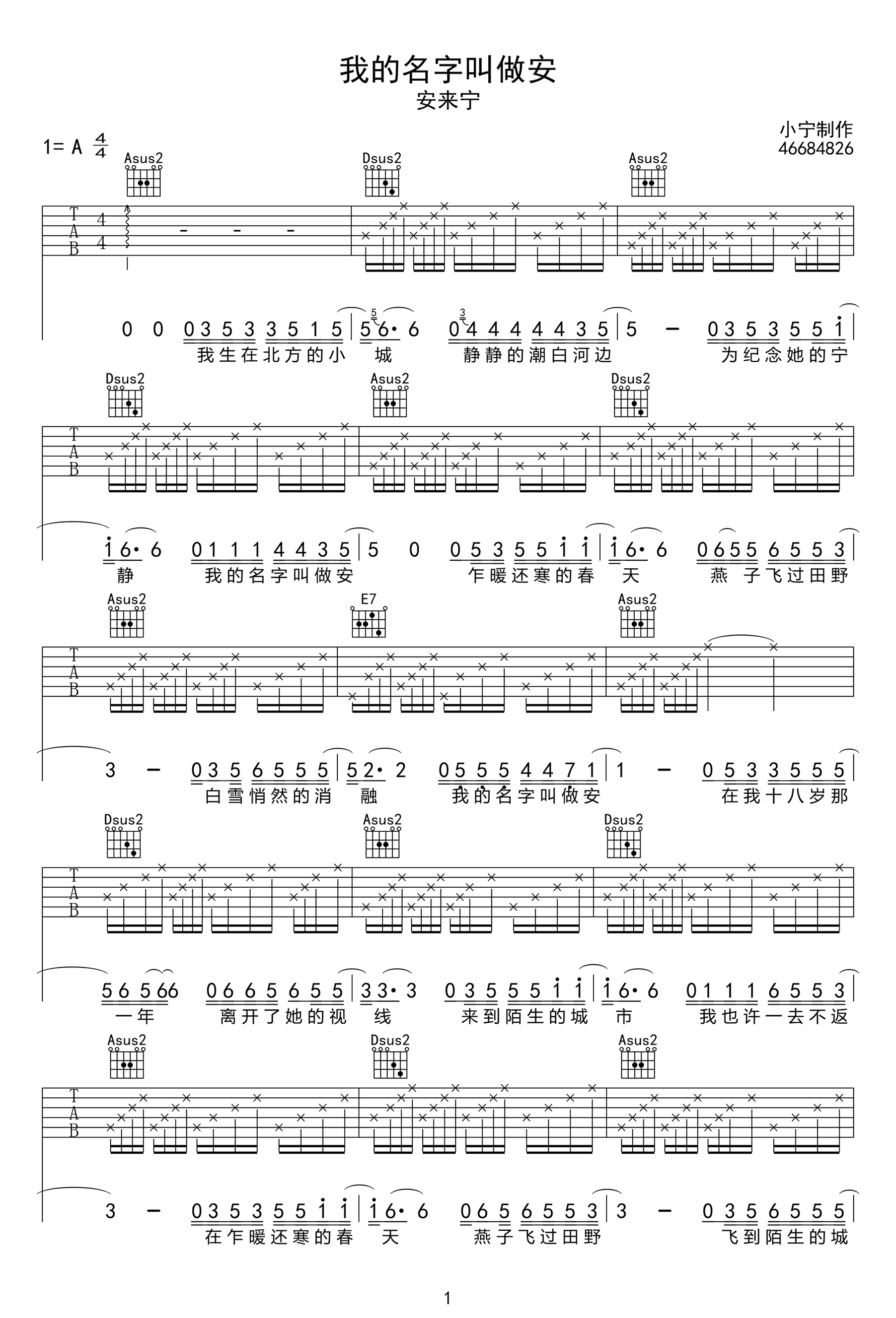吉他安来宁《我的名字叫做安》吉他谱 - 小宁编配