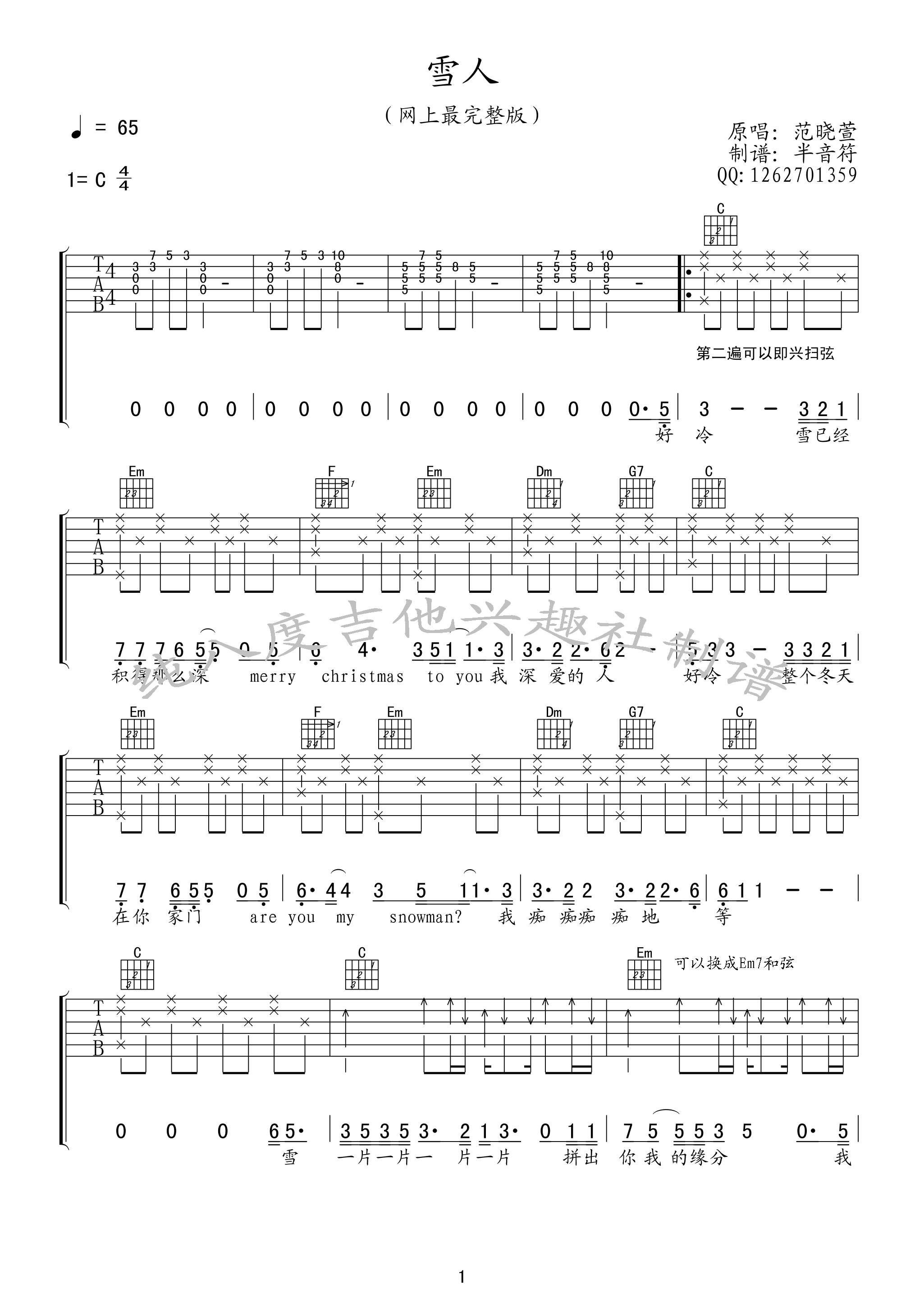 吉他范晓萱《雪人》吉他谱 - 完整版