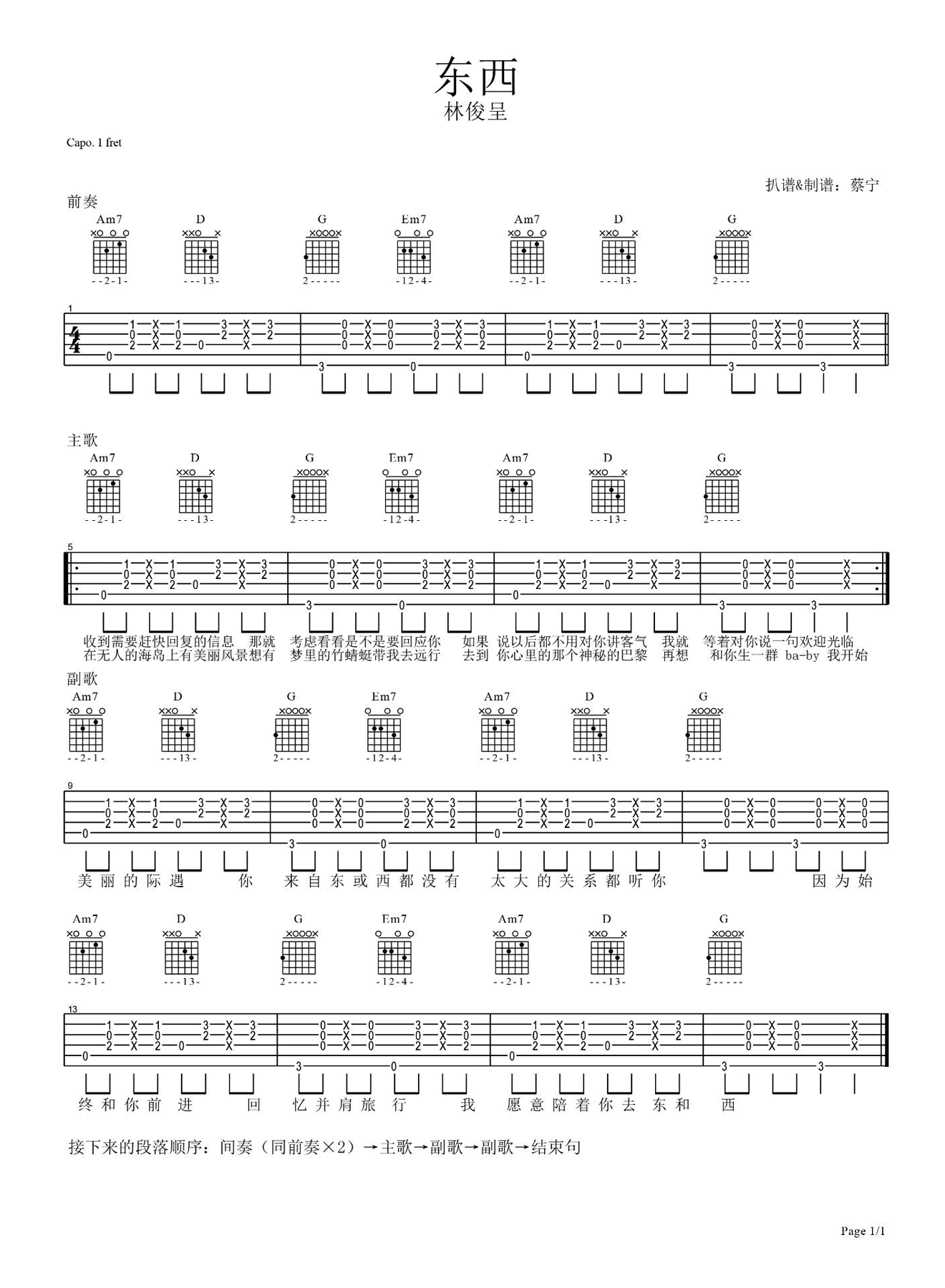 吉他林俊呈《东西》吉他谱