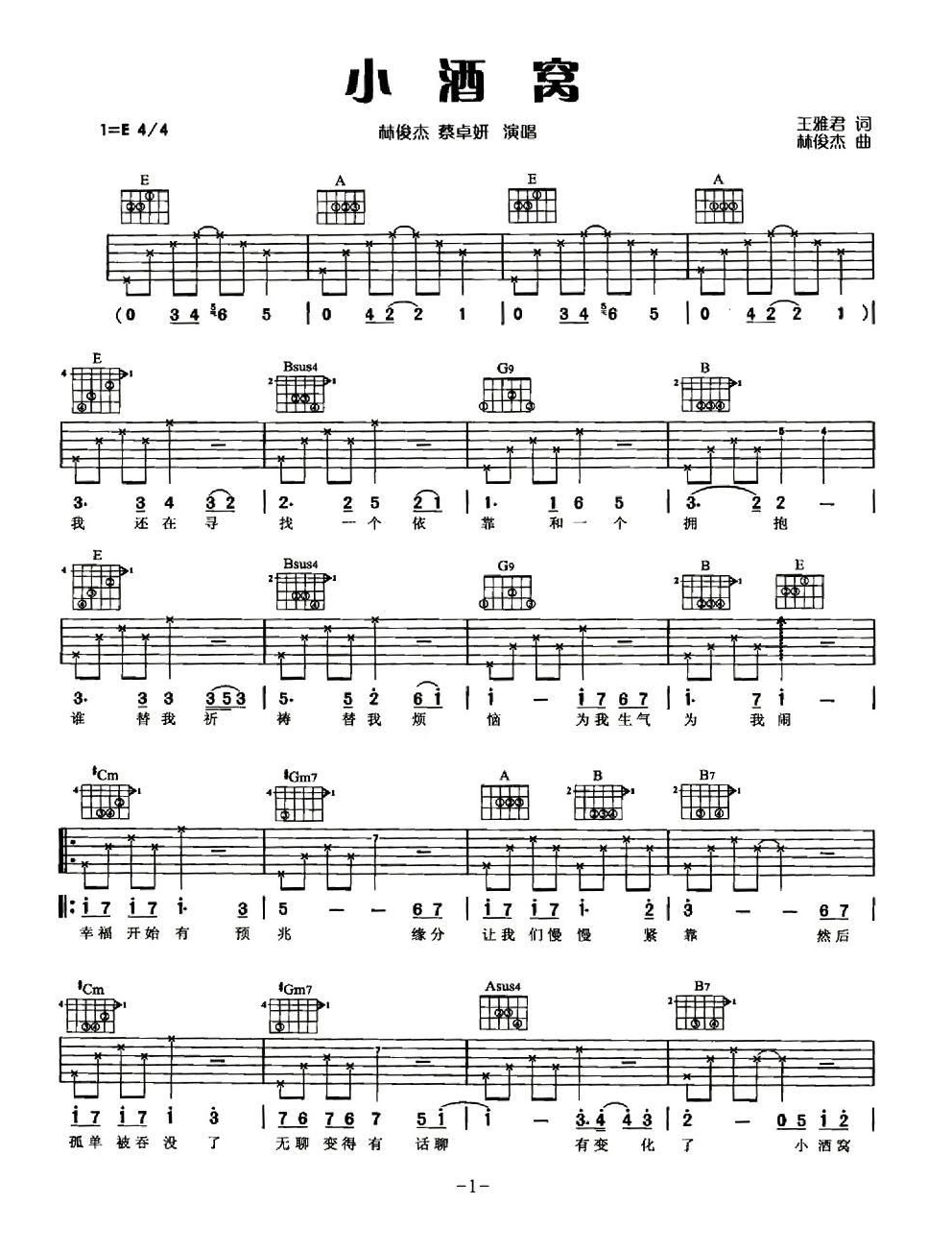 吉他林俊杰蔡卓妍《小酒窝》吉他谱 - 完整版