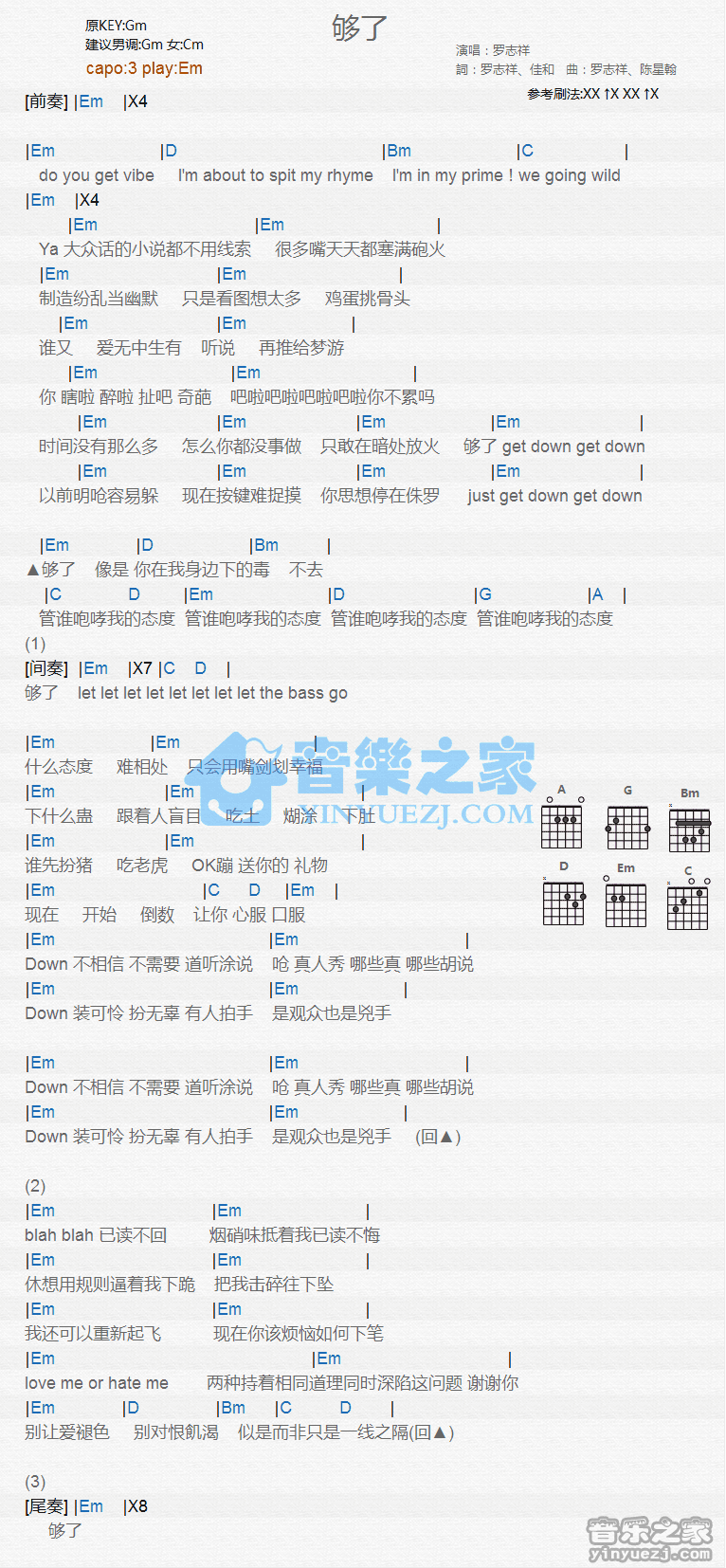Em调版罗志祥《够了》吉他和弦弹唱谱...