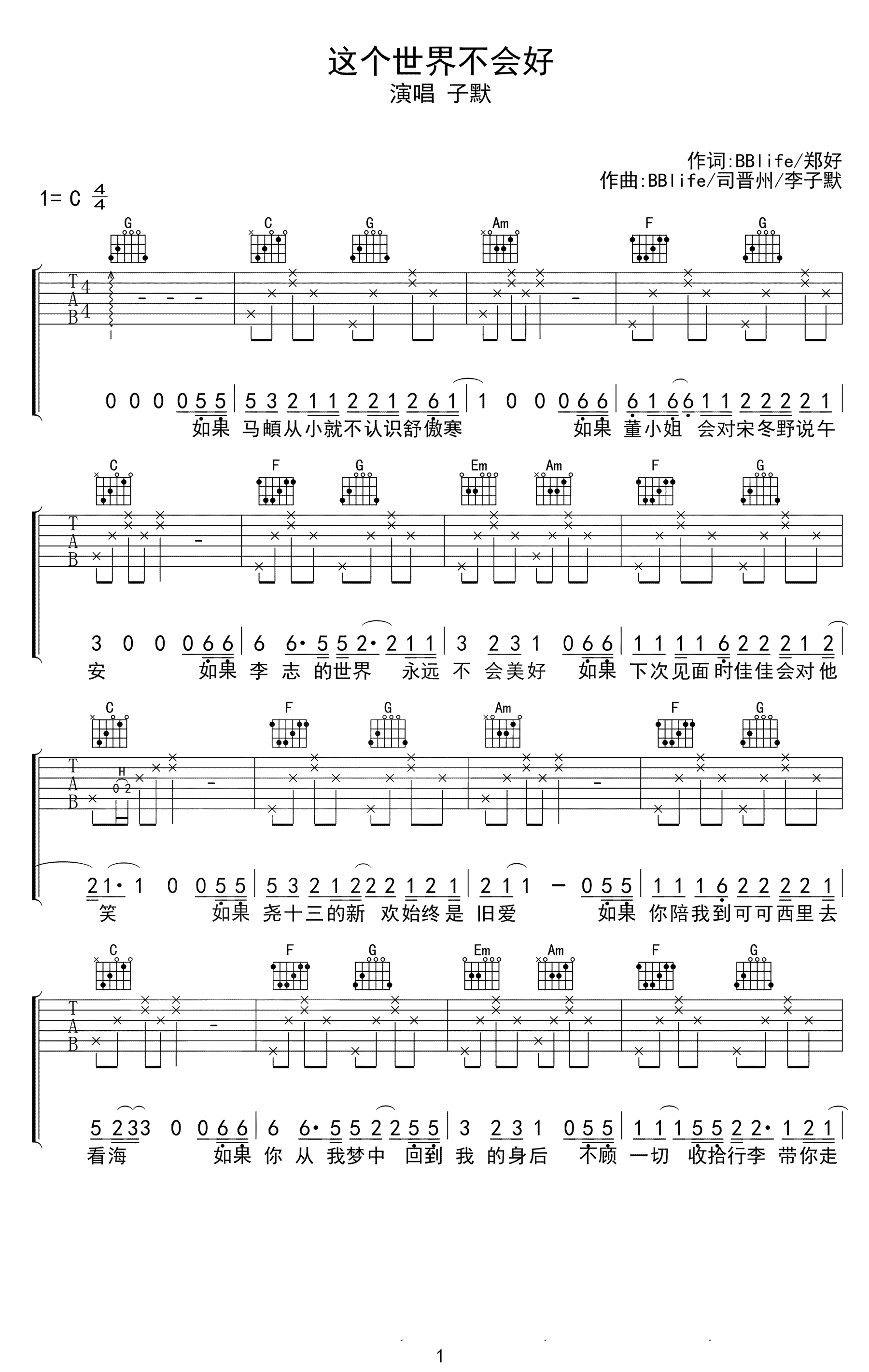 吉他子默《这个世界不会好》吉他谱 - 免费版