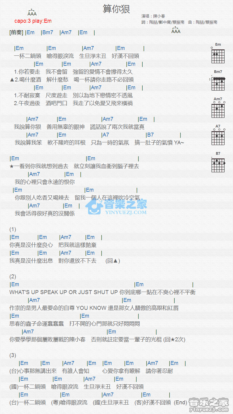 Em调版《算你狠》吉他和弦弹唱谱...