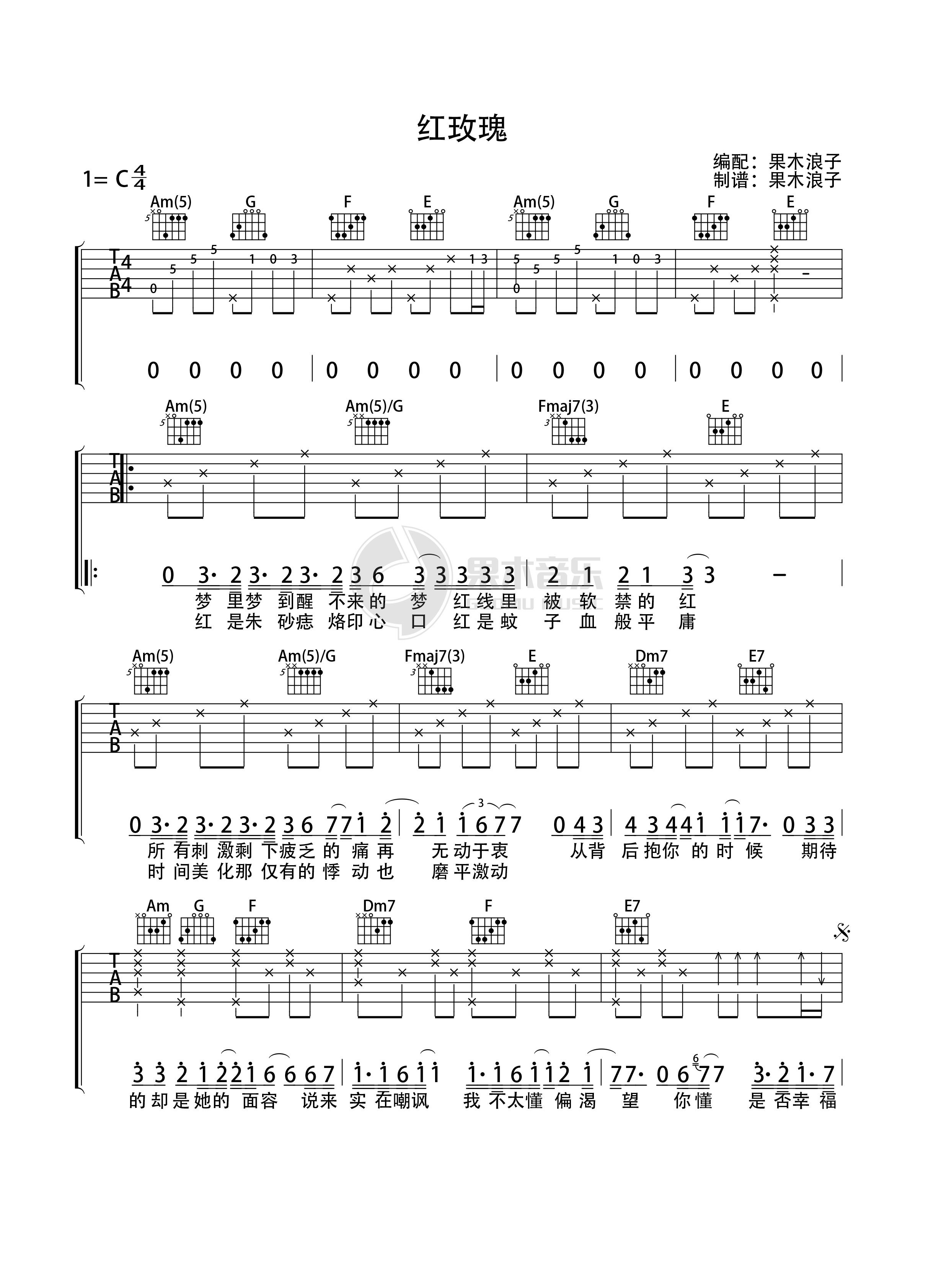 《红玫瑰》吉他谱,果木浪子编配出品,共有3张高清图谱。...