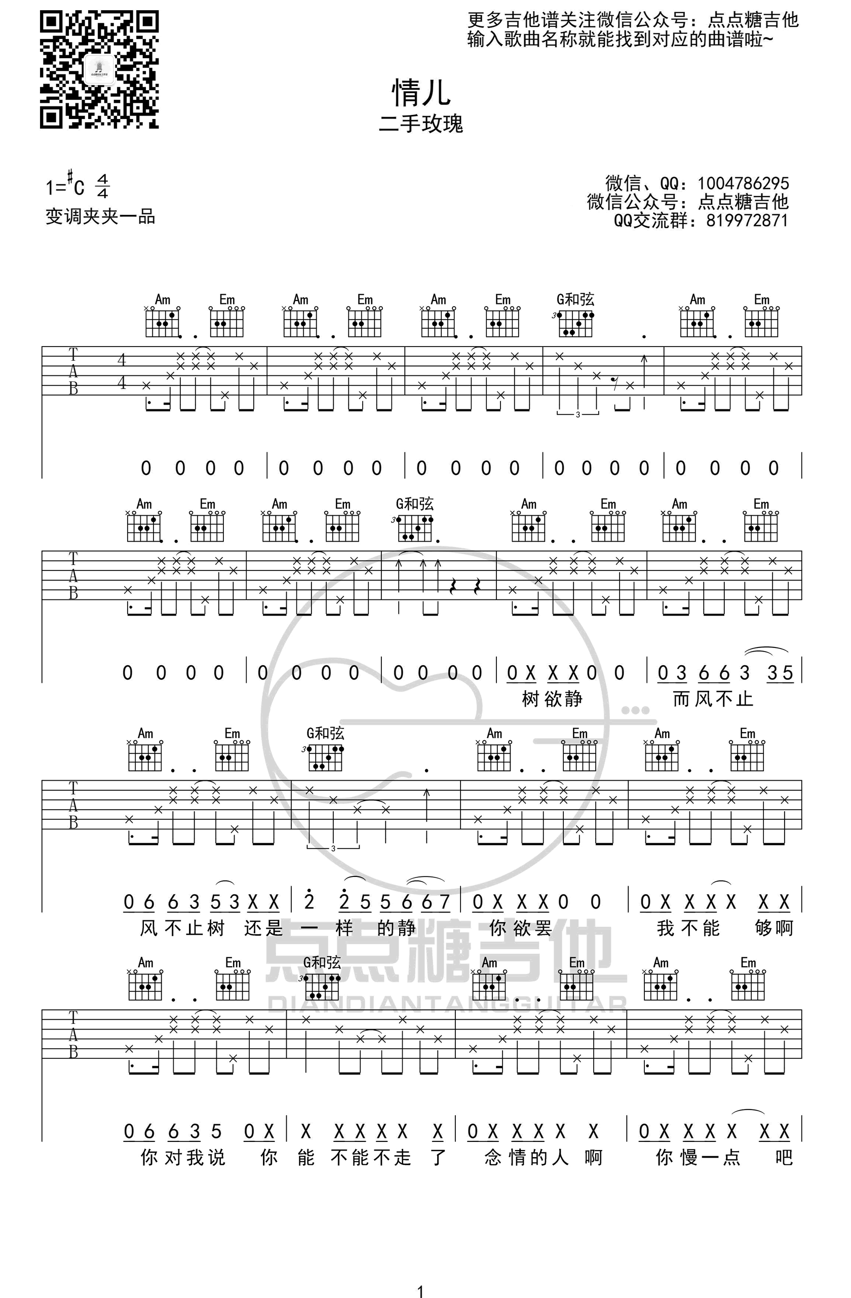 二手玫瑰《情儿》吉他谱,这首歌原唱是二手玫瑰,是C调,老师扒的是视频里那位小姐姐弹唱的版本,她的变调夹夹的是一品,也就是比C调高一个半音的#C调,所以在谱子上我也标注了变调夹夹1品。副歌部分有4/4拍和2/4拍的切换,这里稍微注意一下;在第二页倒数第二排的第三、四个小节的小节线上...