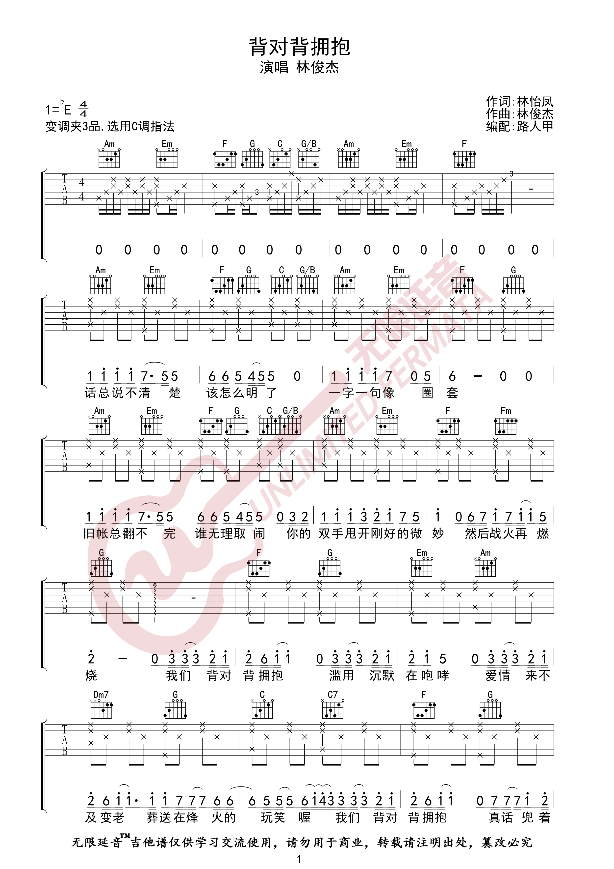 林俊杰《背对背拥抱》吉他谱,无限延音编配出品,共有3张高清图谱。...