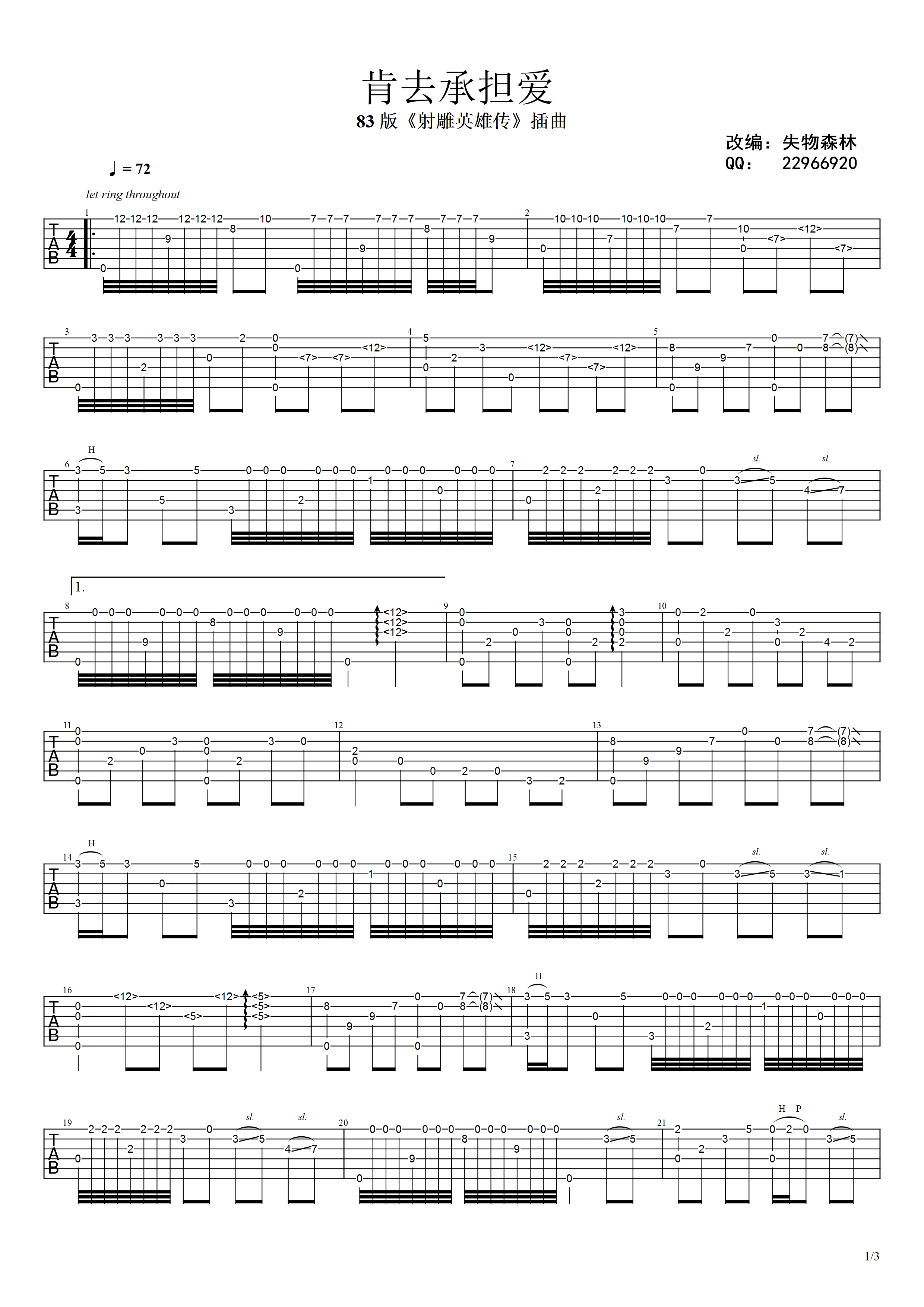 吉他射雕英雄传《肯去承担爱》吉他谱 - 失物森林编配
