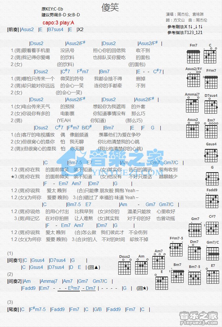 吉他周杰伦/袁咏琳《傻笑》吉他谱 - 小编推荐练习