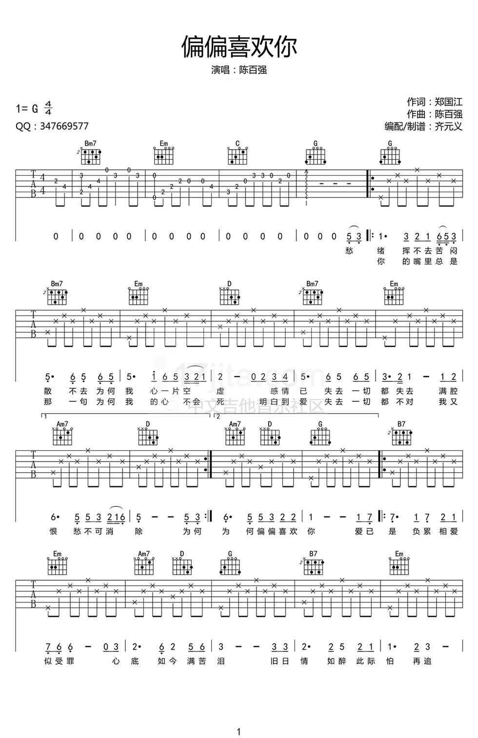 陈百强偏偏喜欢你吉他谱,G调指法编配,一首最爱的经典粤语老歌,熟悉的旋律响起,有那么点忧伤,曾经的一些人事早已远去多年,值得欣慰的是,至少在青春岁月中有老歌伴随成长。陈百强歌曲吉他谱收藏。...