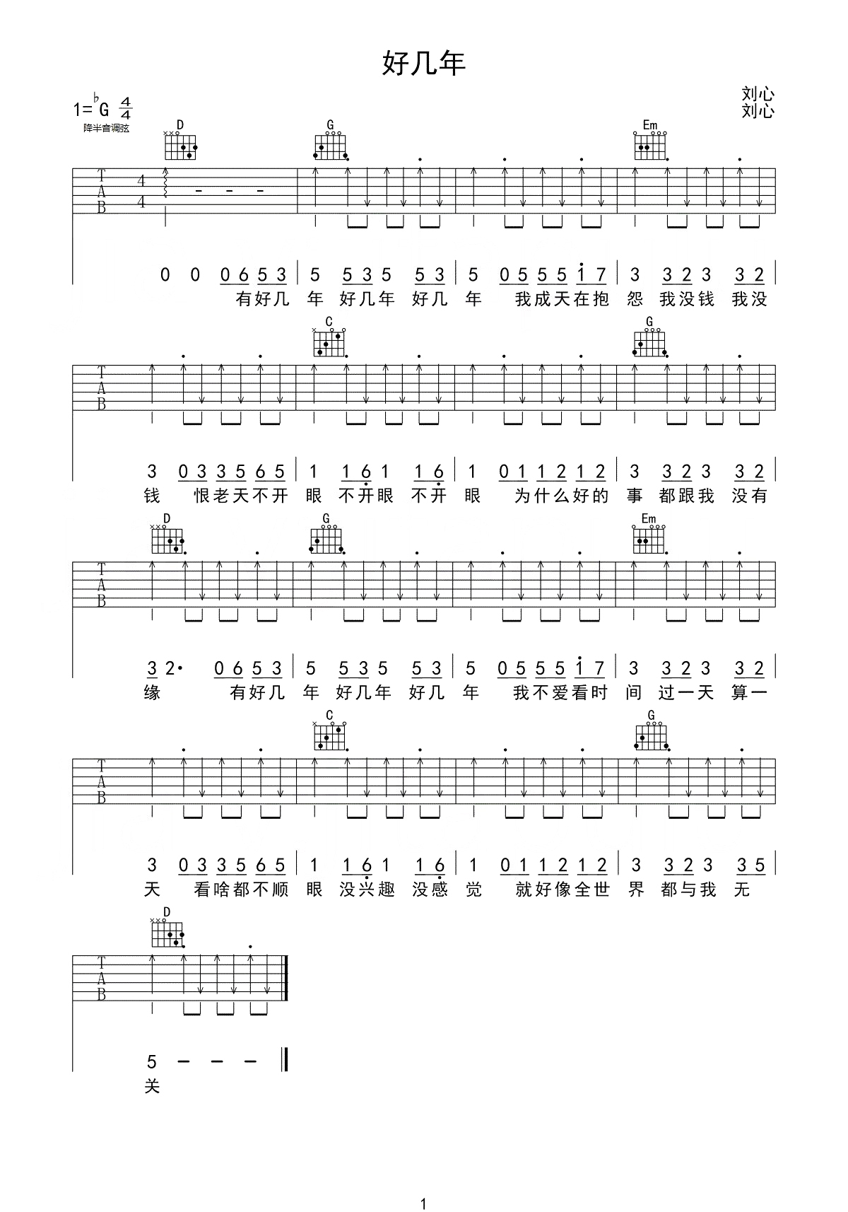 刘心《好几年》吉他谱_G调吉他弹唱谱...