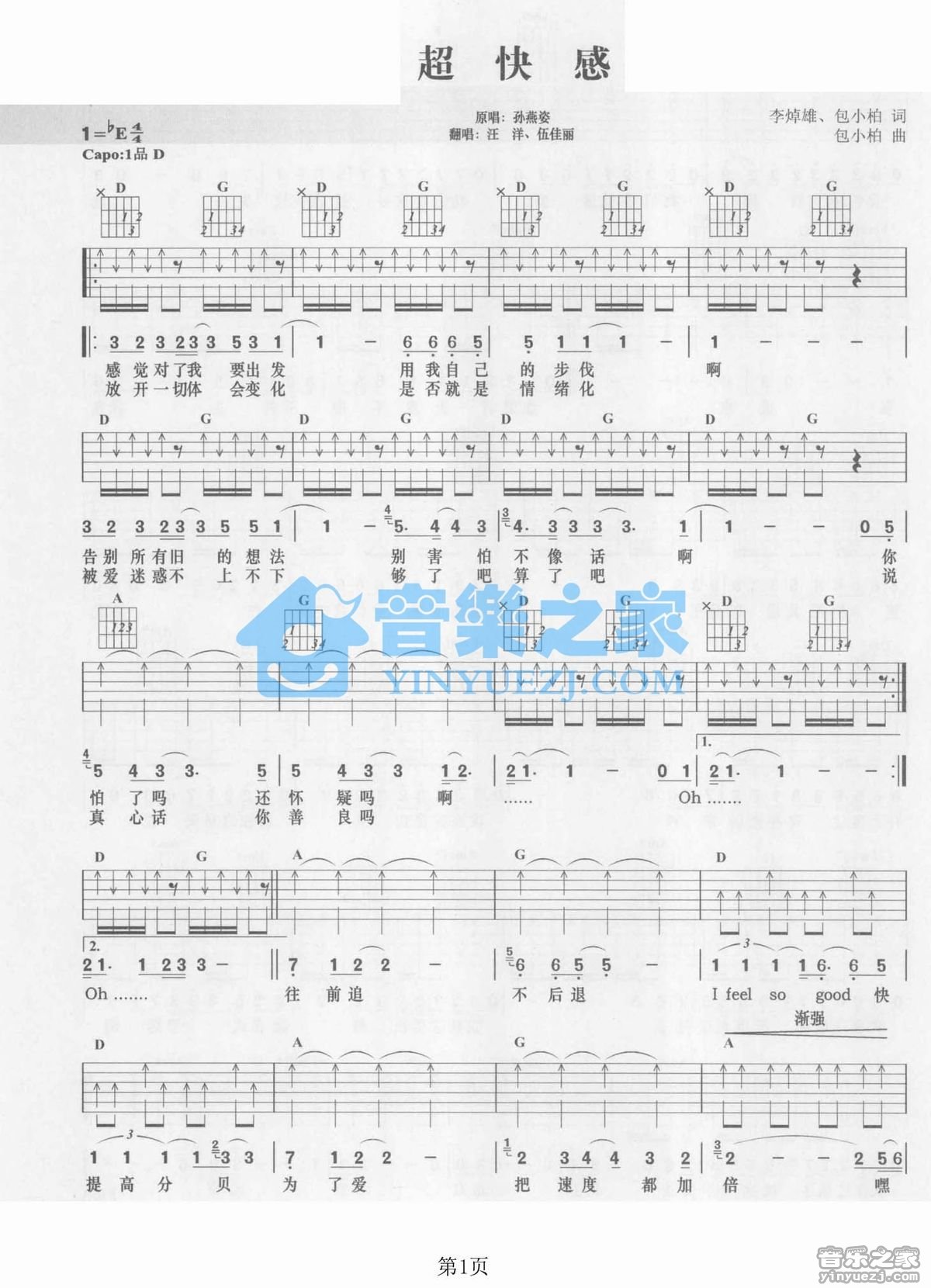 好声音D调版汪洋/伍佳丽《超快感》吉他弹唱六线谱...