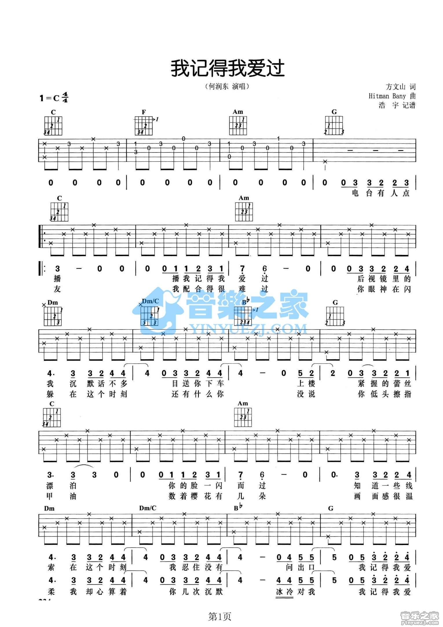 C调版《记得我爱过》吉他弹唱六线谱...