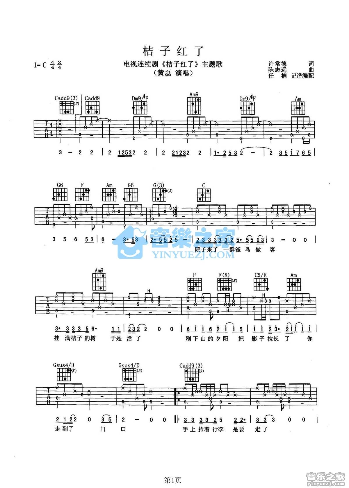 C调版黄磊《桔子红了》吉他弹唱六线谱...