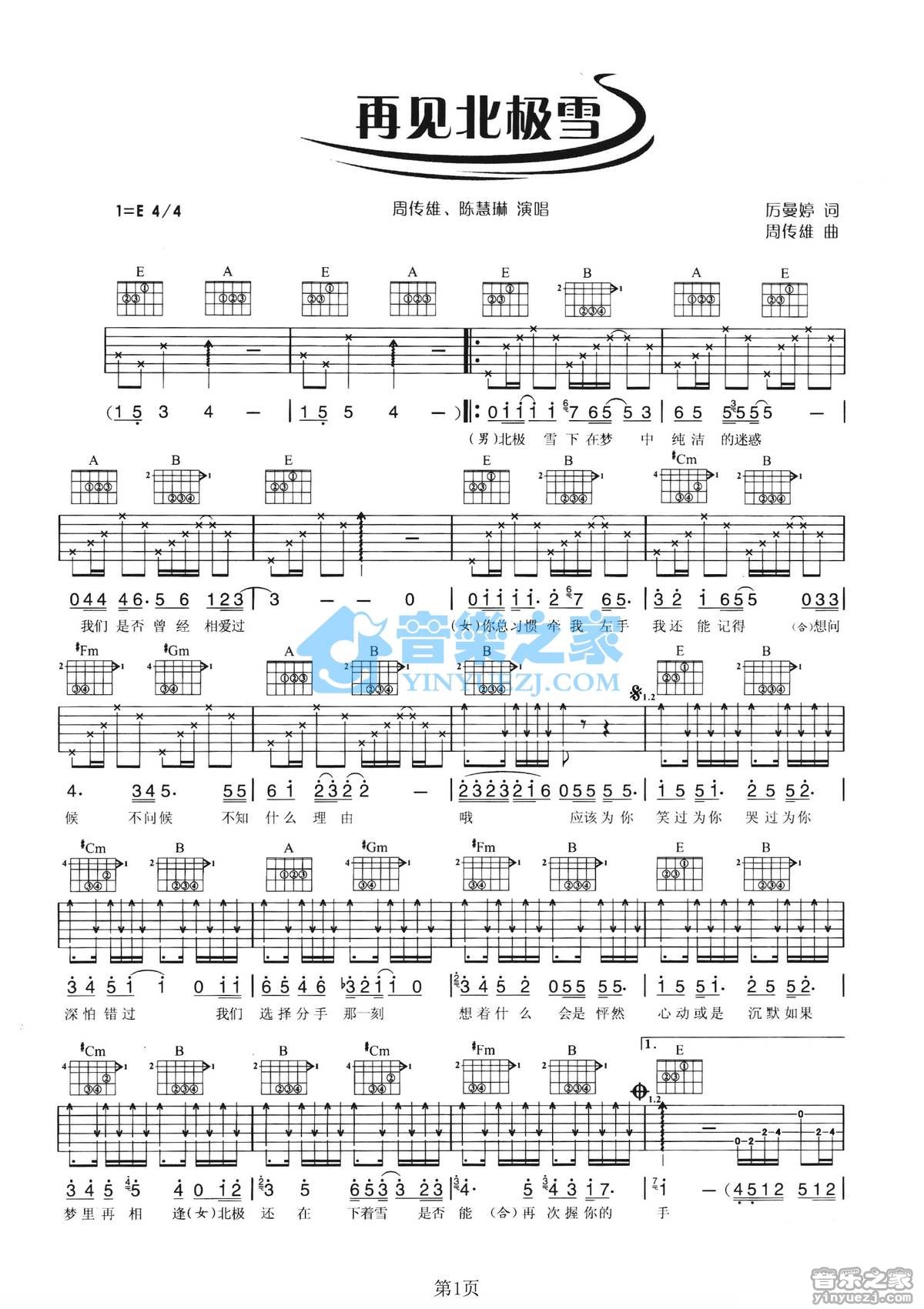E调版周传雄/陈慧琳《再见北极雪》吉他弹唱六线谱...