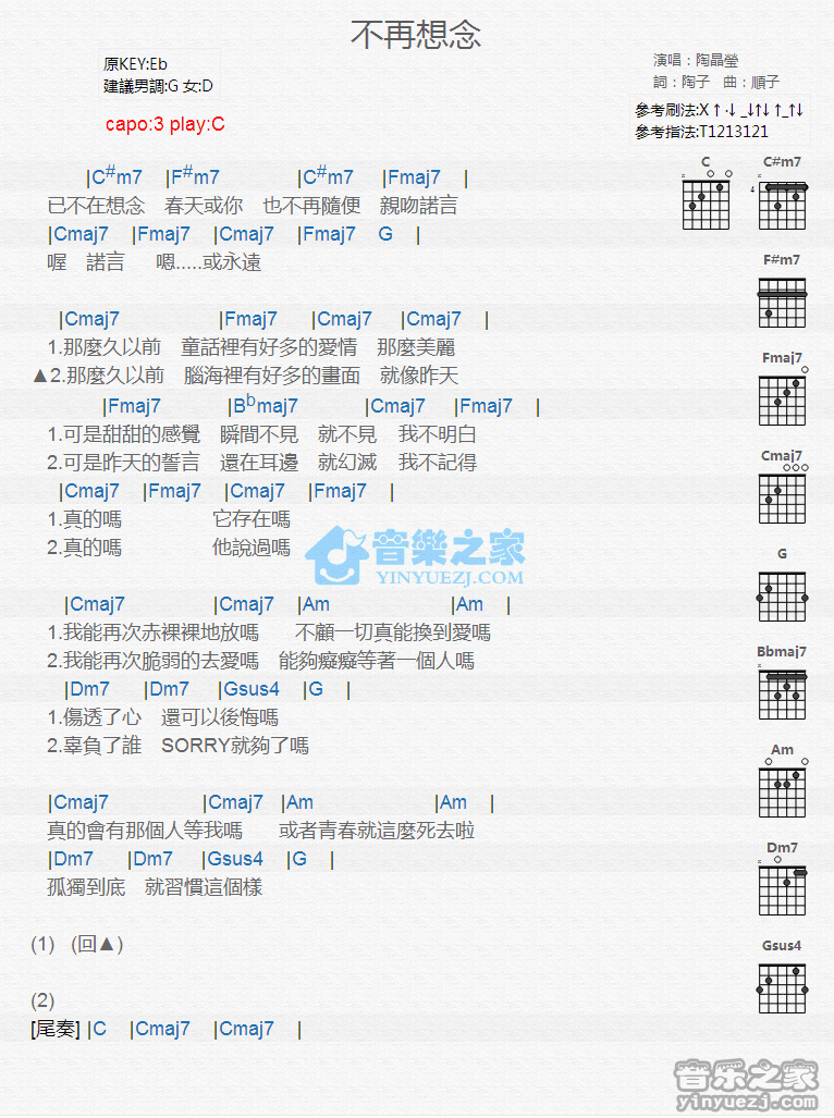 吉他陶晶莹《不再想念》吉他谱