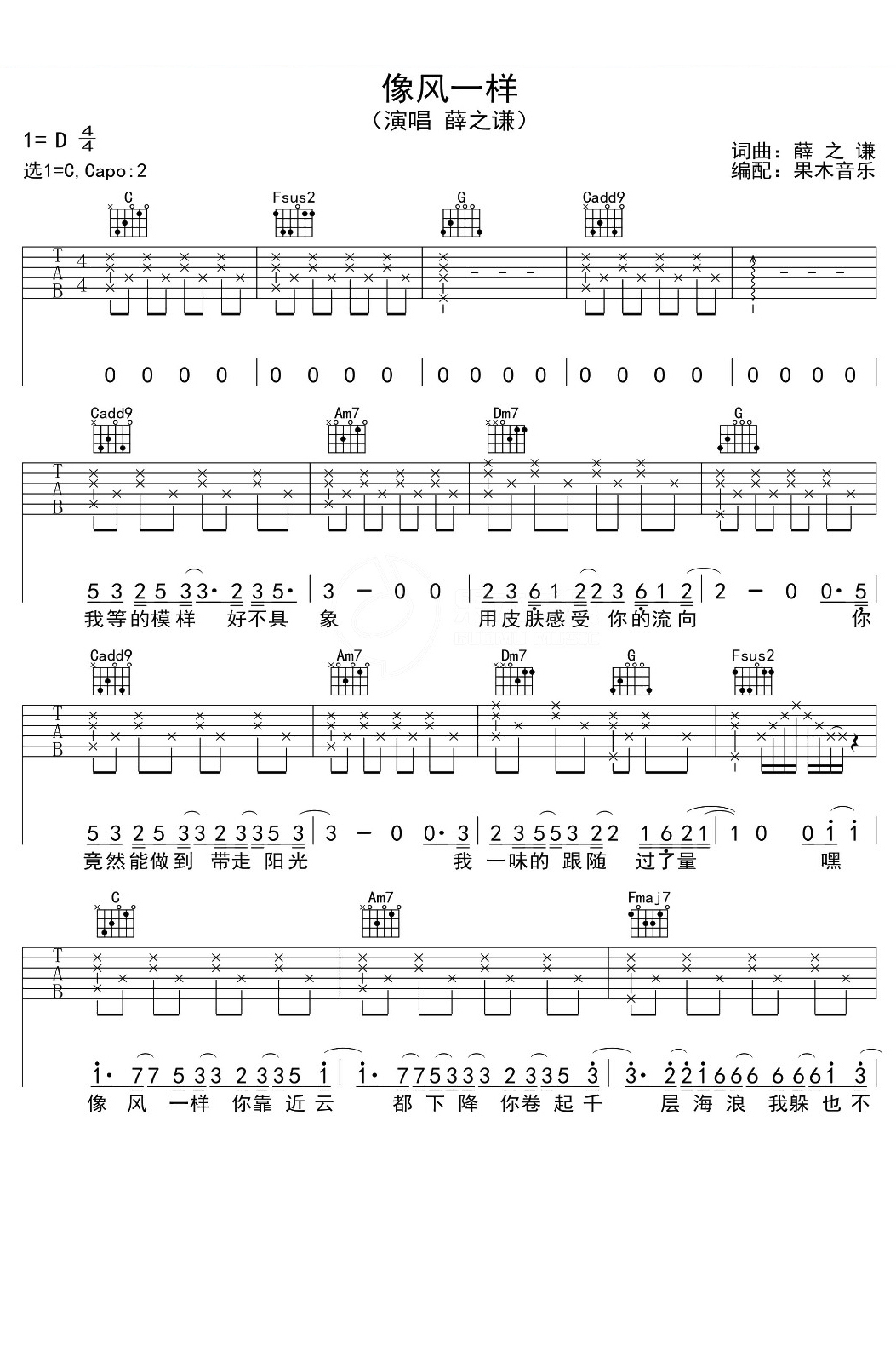 薛之谦《像风一样》吉他谱_C调吉他弹唱谱...