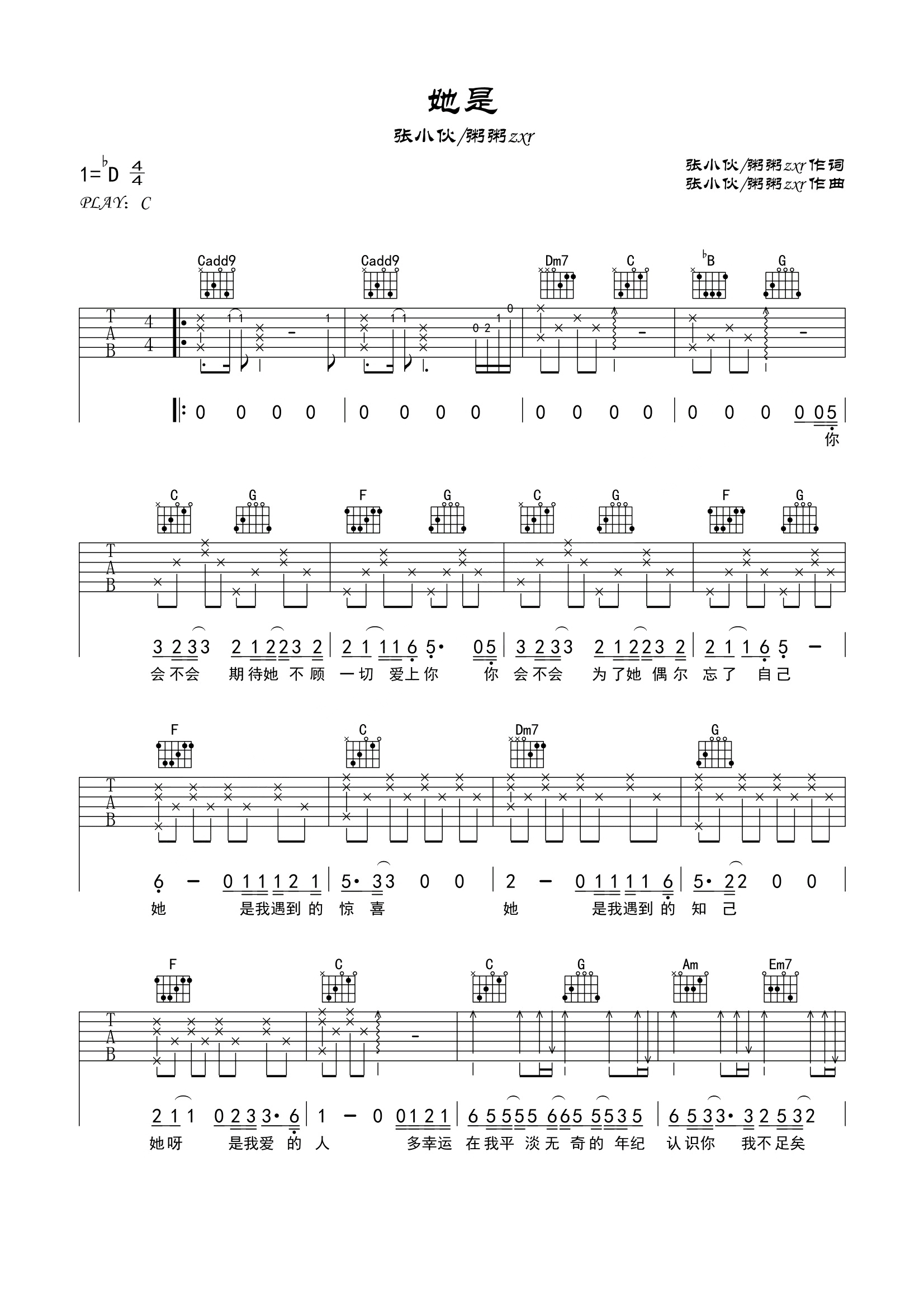 吉他张小伙《她是》吉他谱